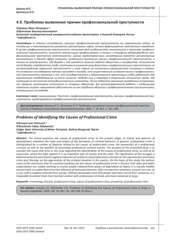 Kravets I.P., (2022), Problems of special measures to prevent professional crime. Gaps in Russian legislation, 2: 134-143. EDN: PZUKUF