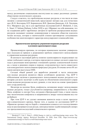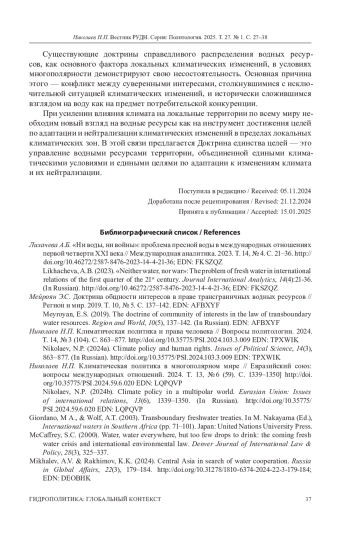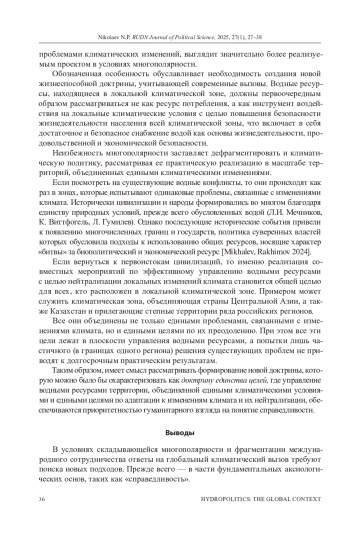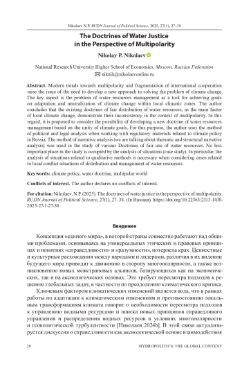 Современные тенденции к многополярности и фрагментации международного сотрудничества ставят вопрос о необходимости формирования нового подхода к решению проблемы климатических изменений. В качестве ключевого аспекта выступает проблема управления водными ресурсами как инструмента достижения целей по адаптации и нейтрализации климатических изменений в пределах локальных климатических зон. Автором сделан вывод, что существующие доктрины справедливого распределения водных ресурсов, как основного фактора локальных климатических изменений, в условиях многополярности демонстрируют свою несостоятельность. В этой связи предложено рассмотреть возможность формирования новой доктрины управления водными ресурсами, основанной на единстве климатических целей. Использован метод политико-правового анализа при работе с нормативно-правовыми материалами, касающимися климатической политики в России. Метод нарративного анализа (речь идёт о тематическом и структурном нарративном анализе) применялся при изучении различных доктрин справедливости использования водных ресурсов. Не менее важное место в исследовании занимает анализ ситуаций (case study). В частности, анализ ситуаций, относящийся к качественным методам, необходим при рассмотрении кейсов, связанных с локальными конфликтными ситуациями распределения и управления водными ресурсами.