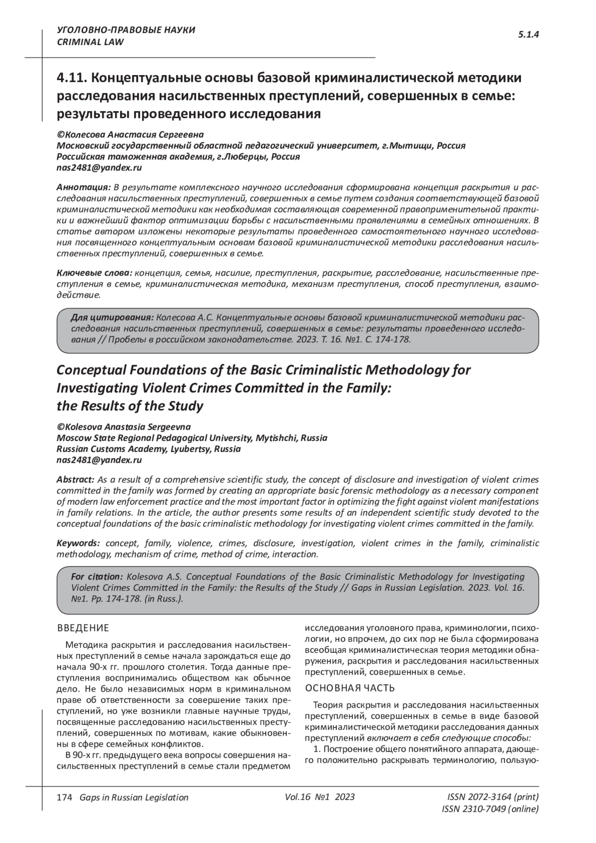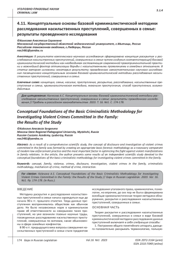 Статья: КОНЦЕПТУАЛЬНЫЕ ОСНОВЫ БАЗОВОЙ КРИМИНАЛИСТИЧЕСКОЙ МЕТОДИКИ РАССЛЕДОВАНИЯ НАСИЛЬСТВЕННЫХ ПРЕСТУПЛЕНИЙ, СОВЕРШЕННЫХ В СЕМЬЕ: РЕЗУЛЬТАТЫ ПРОВЕДЕННОГО ИССЛЕДОВАНИЯ (2023)