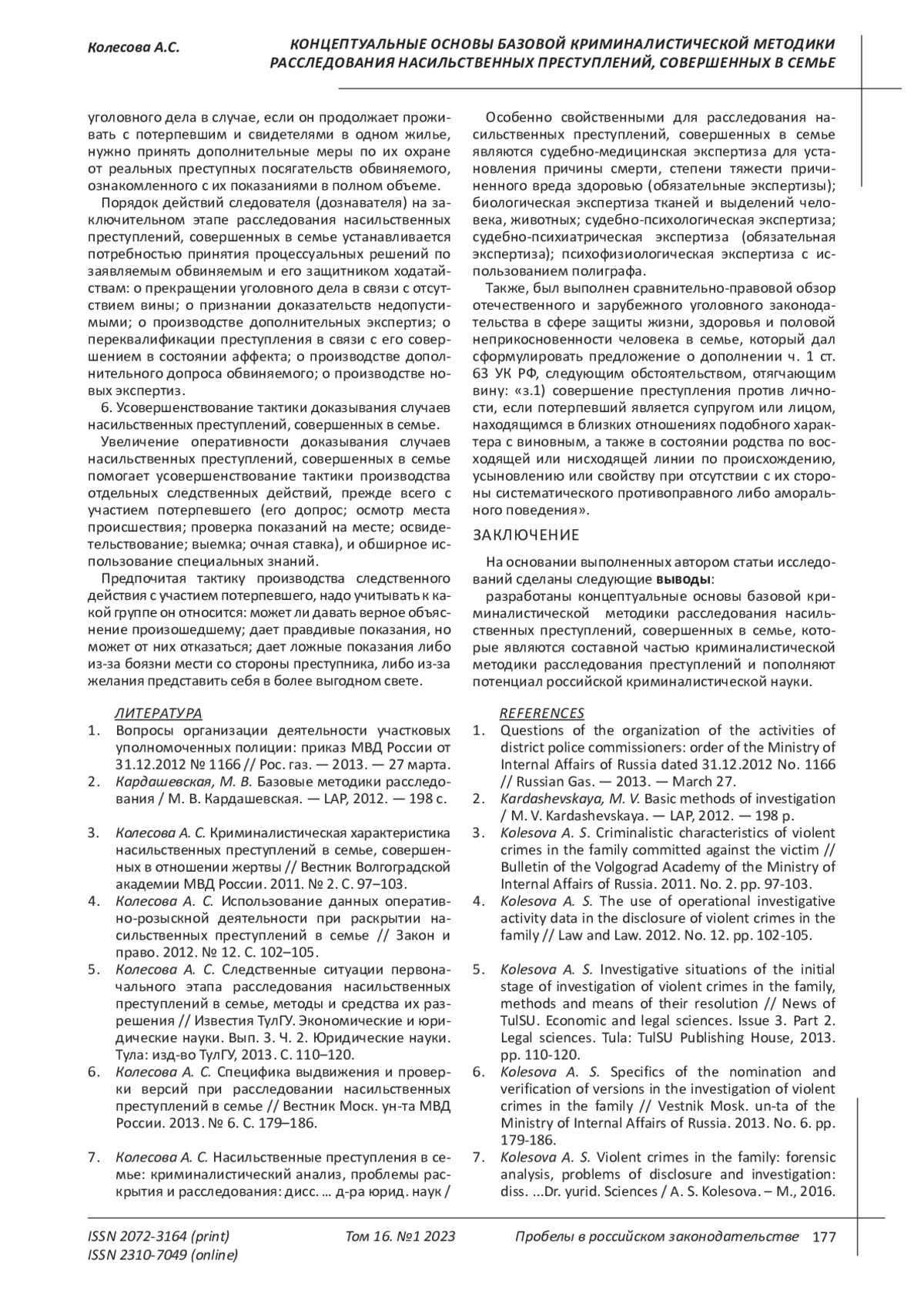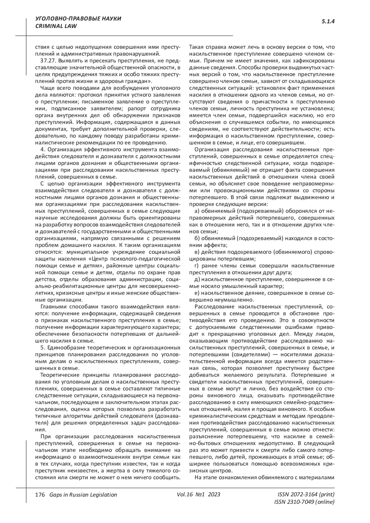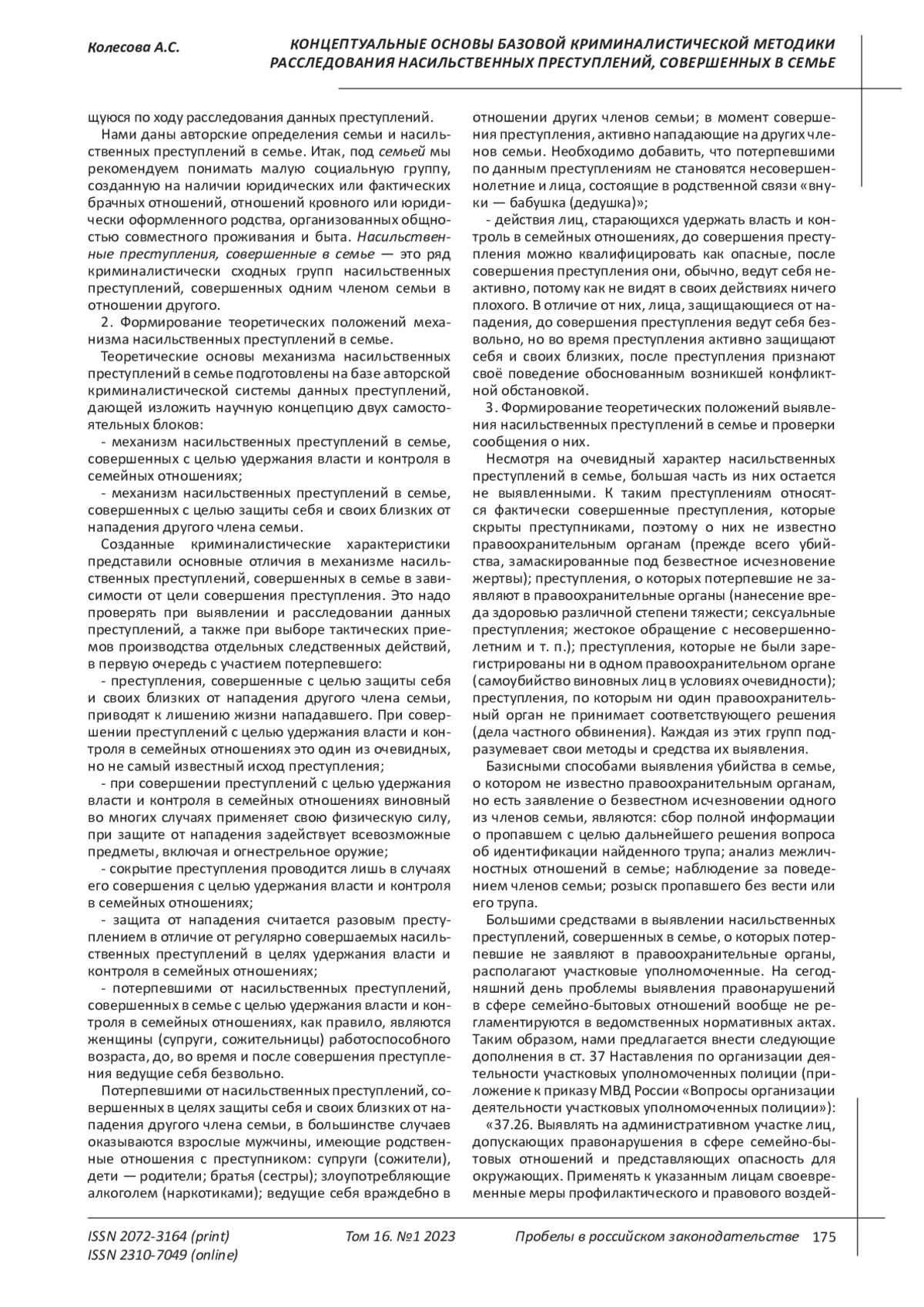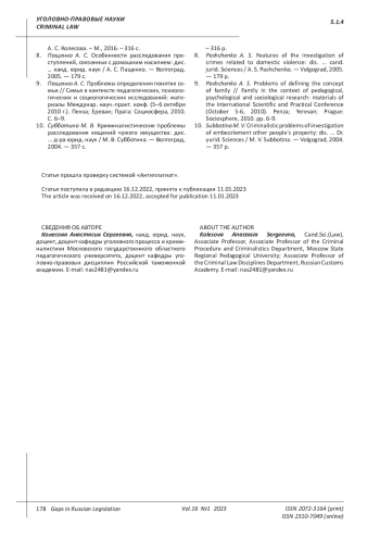 NAS2481 КОНЦЕПТУАЛЬНЫЕ ОСНОВЫ БАЗОВОЙ КРИМИНАЛИСТИЧЕСКОЙ МЕТОДИКИ РАССЛЕДОВАНИЯ НАСИЛЬСТВЕННЫХ ПРЕСТУПЛЕНИЙ, СОВЕРШЕННЫХ В СЕМЬЕ: РЕЗУЛЬТАТЫ ПРОВЕДЕННОГО ИССЛЕДОВАНИЯ // ПРОБЕЛЫ В РОССИЙСКОМ ЗАКОНОДАТЕЛЬСТВЕ. 2023. Т. 16 № 1