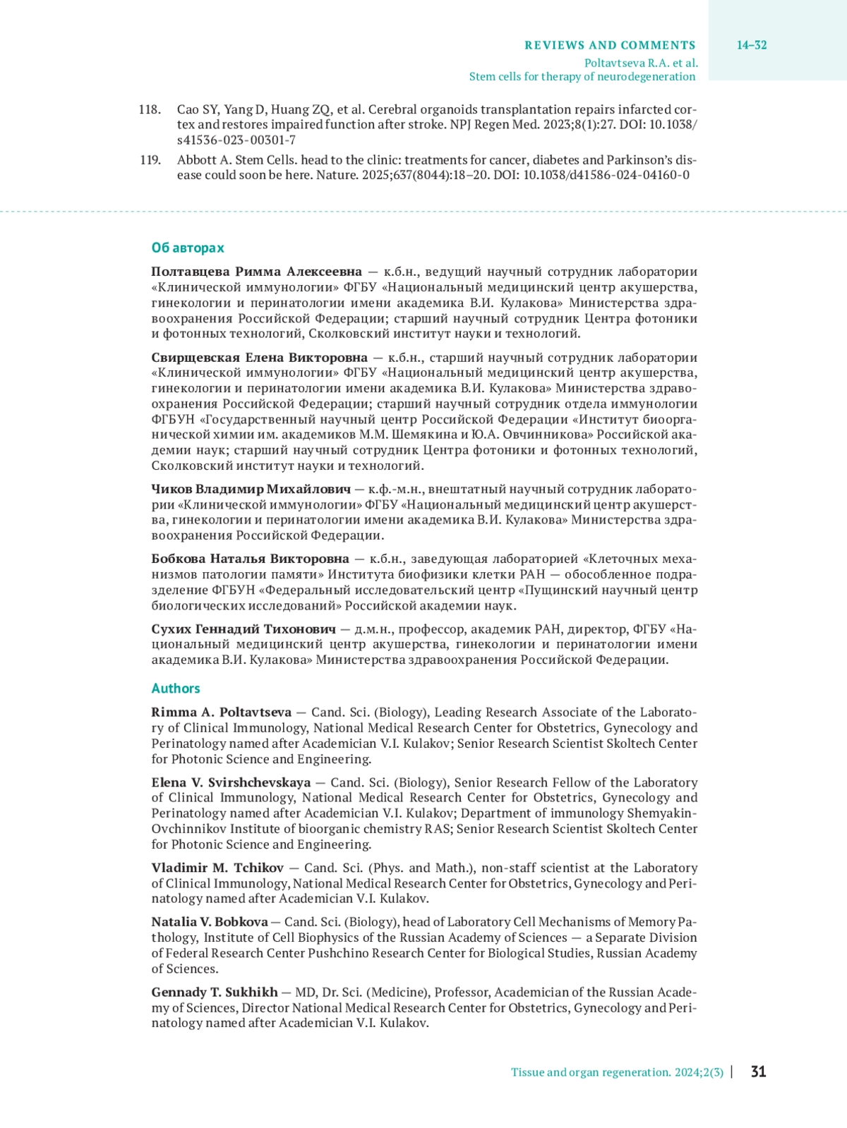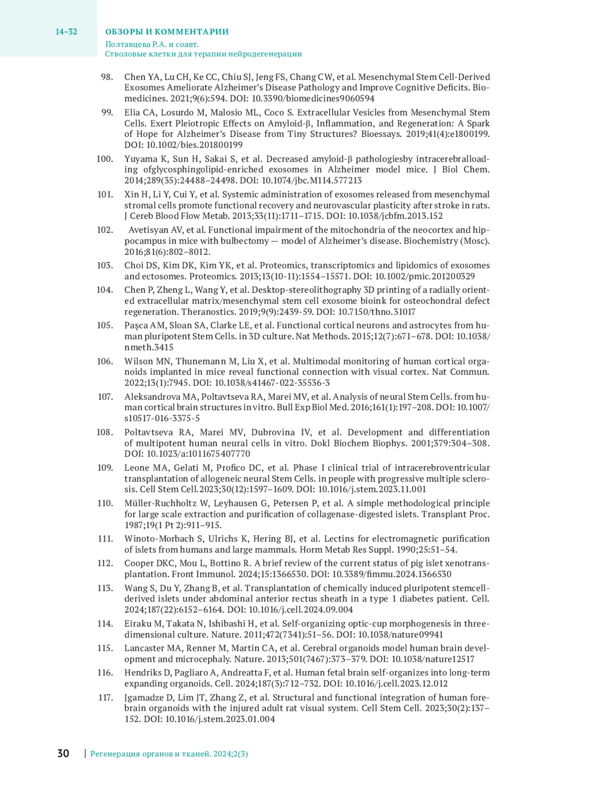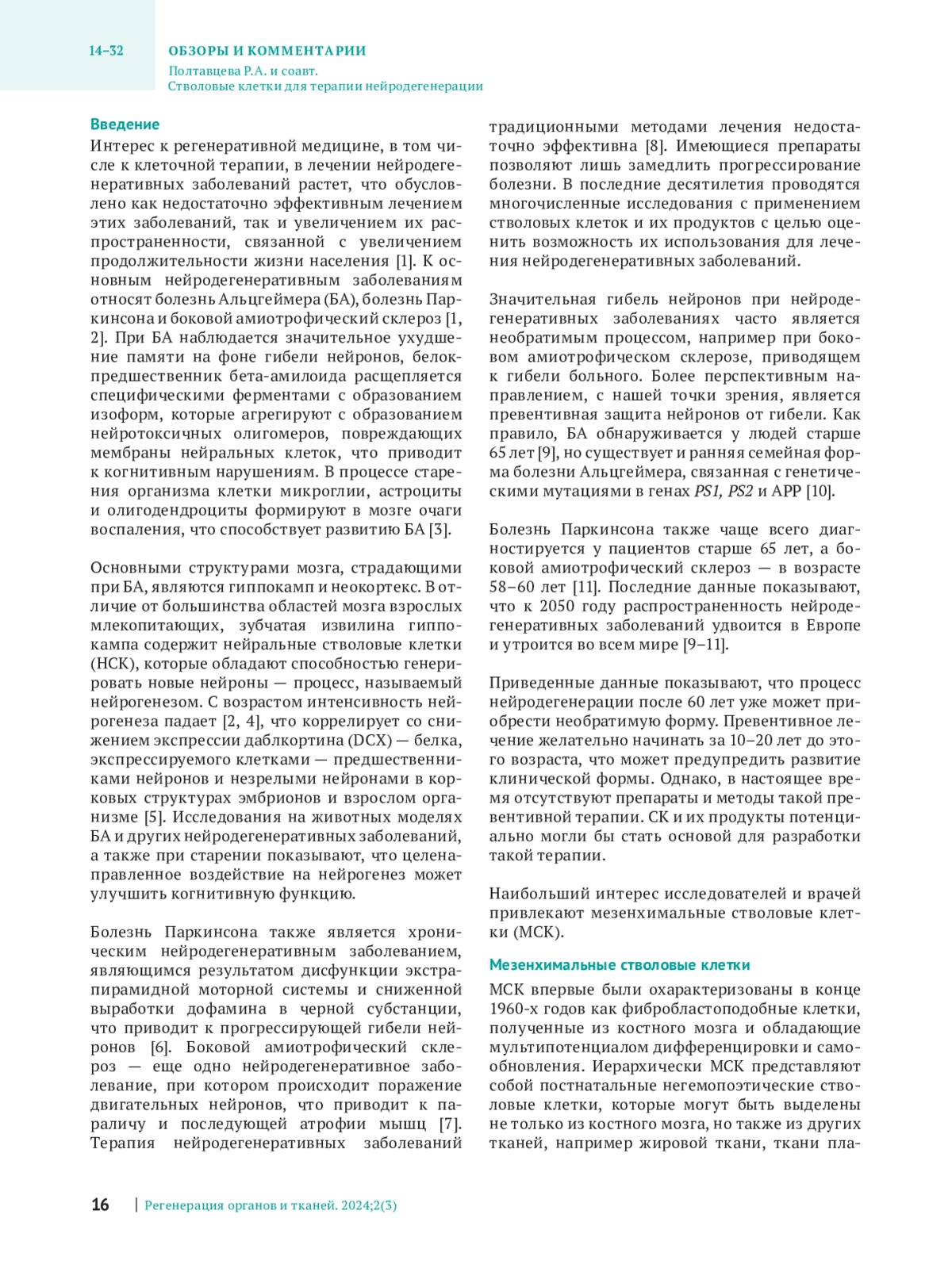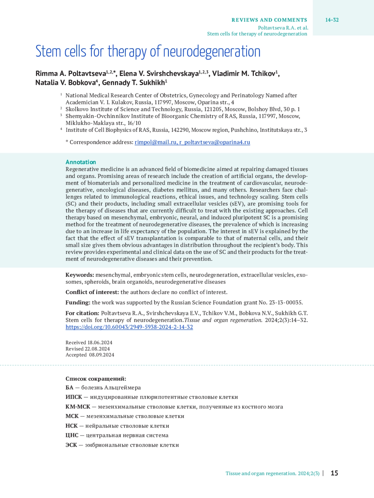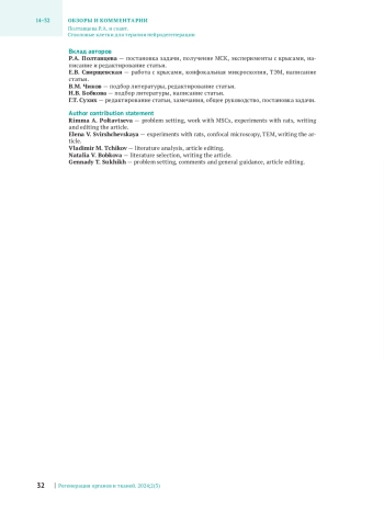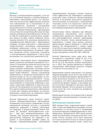 ПОЛТАВЦЕВА Р. А., СВИРЩЕВСКАЯ Е. В., ЧИКОВ В. М., БОБКОВА Н. В., СУХИХ Г. Т. СТВОЛОВЫЕ КЛЕТКИ ДЛЯ ТЕРАПИИ НЕЙРОДЕГЕНЕРАЦИИ // РЕГЕНЕРАЦИЯ ОРГАНОВ И ТКАНЕЙ. 2025. № 3, ТОМ 2