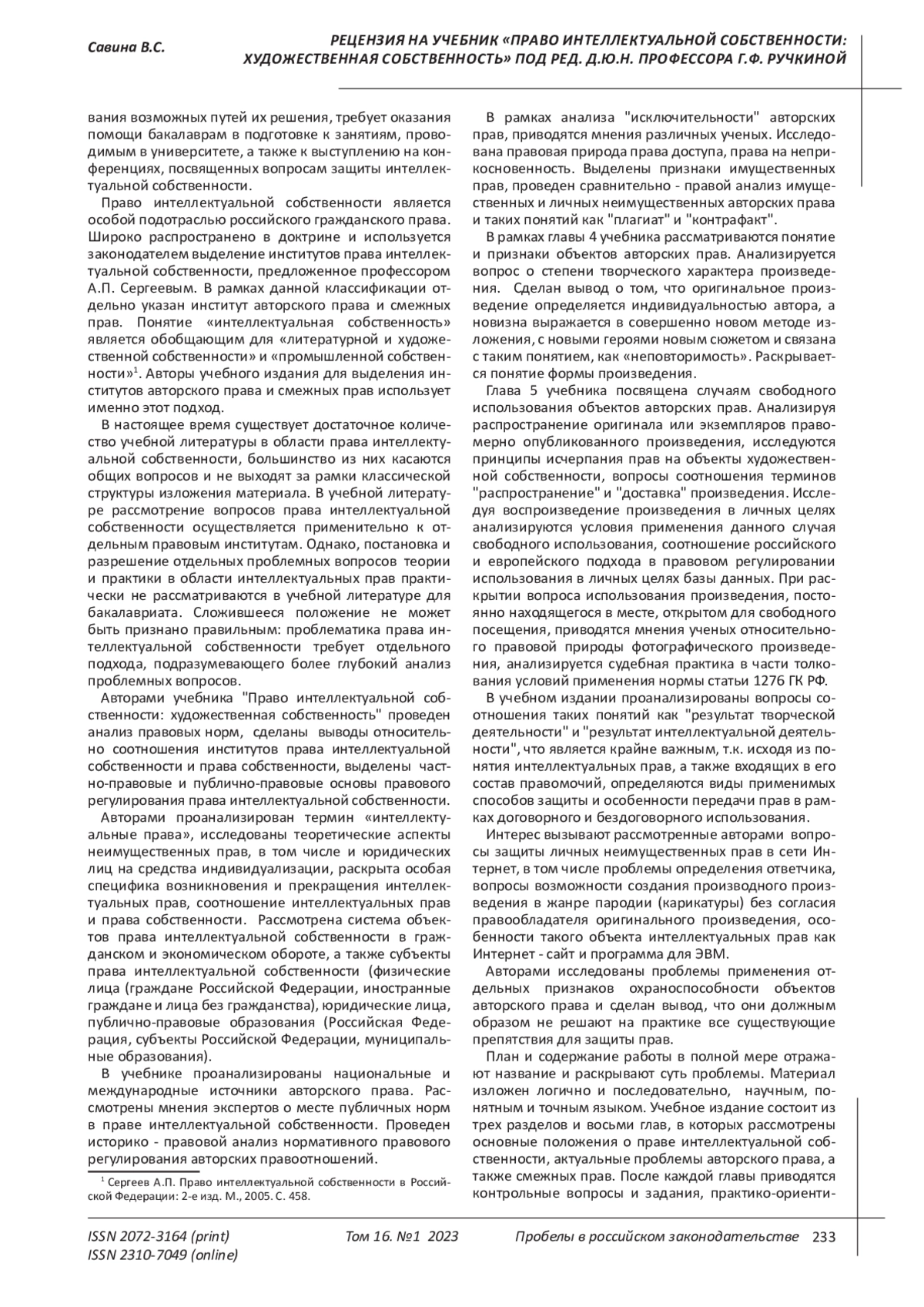 1. Сергеев А.П. Право интеллектуальной собственности в Российской Федерации: 2-е изд. М., 2005. С. 458.