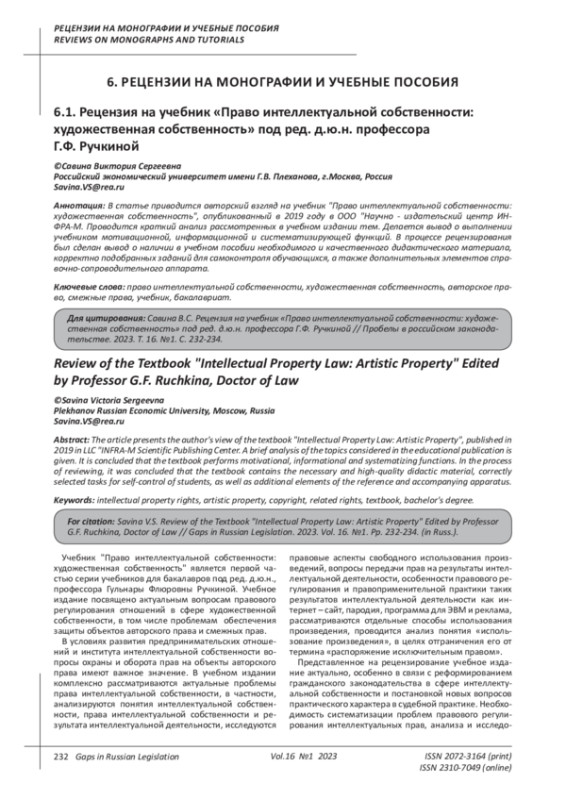 В статье приводится авторский взгляд на учебник “Право интеллектуальной собственности: художественная собственность”, опубликованный в 2019 году в ООО “Научно - издательский центр ИНФРА-М. Проводится краткий анализ рассмотренных в учебном издании тем. Делается вывод о выполнении учебником мотивационной, информационной и систематизирующей функций. В процессе рецензирования был сделан вывод о наличии в учебном пособии необходимого и качественного дидактического материала, корректно подобранных заданий для самоконтроля обучающихся, а также дополнительных элементов справочно-сопроводительного аппарата.