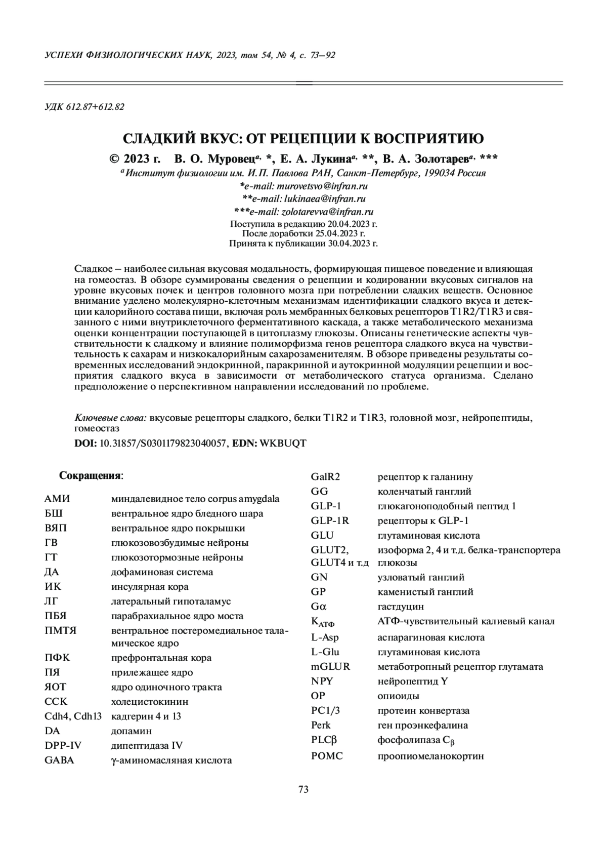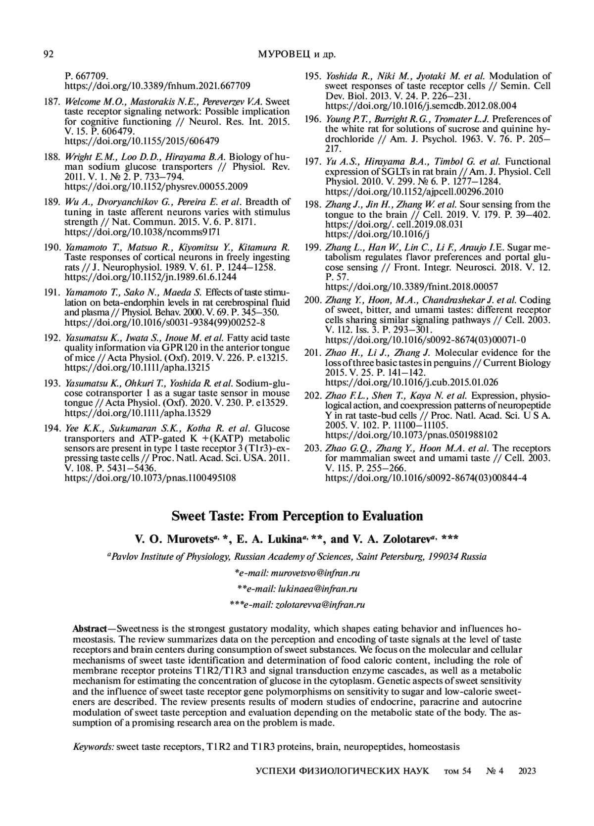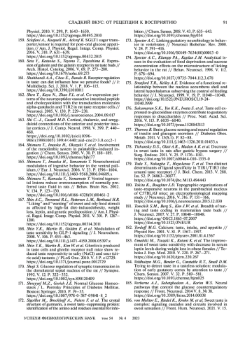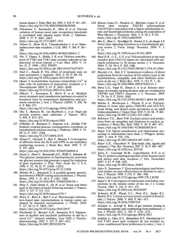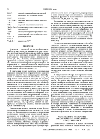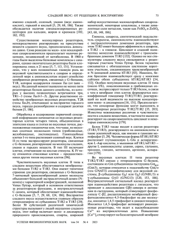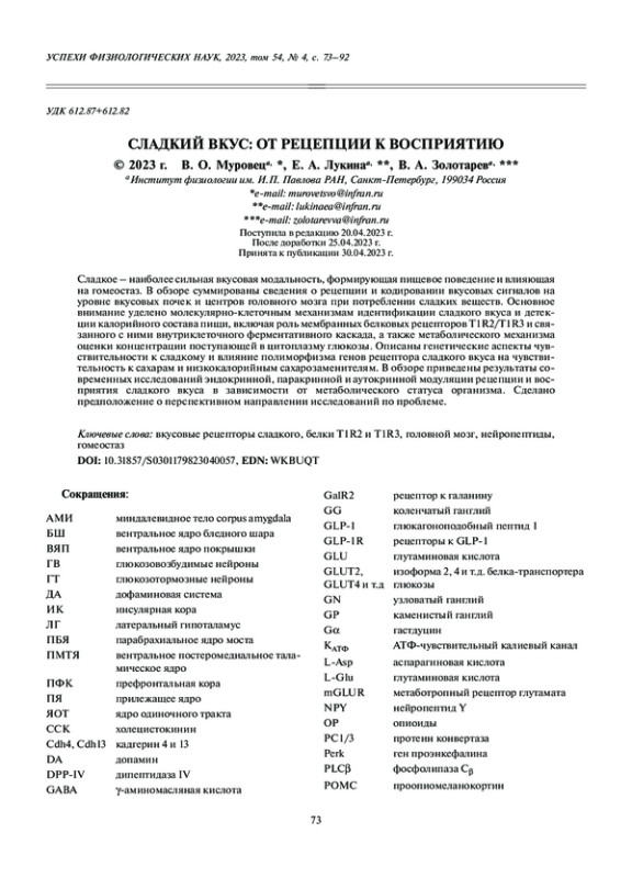 МУРОВЕЦ В. О., ЛУКИНА Е. А., ЗОЛОТАРЕВ В. А. СЛАДКИЙ ВКУС: ОТ РЕЦЕПЦИИ К ВОСПРИЯТИЮ // УСПЕХИ ФИЗИОЛОГИЧЕСКИХ НАУК. 2023. Т. 54 № 4 (6 СТ.)