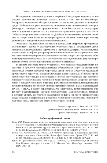 1. Белов С.И. Компьютерные игры как инструмент реализации политики памяти (на примере отображения событий Великой Отечественной войны в видеоиграх) // Вестник Российского университета дружбы народов. Серия: Политология. 2018. Т. 20. № 1. С. 96-104. DOI: 10.22363/2313-1438-2018-20-1-96-104 EDN: YTFDVS