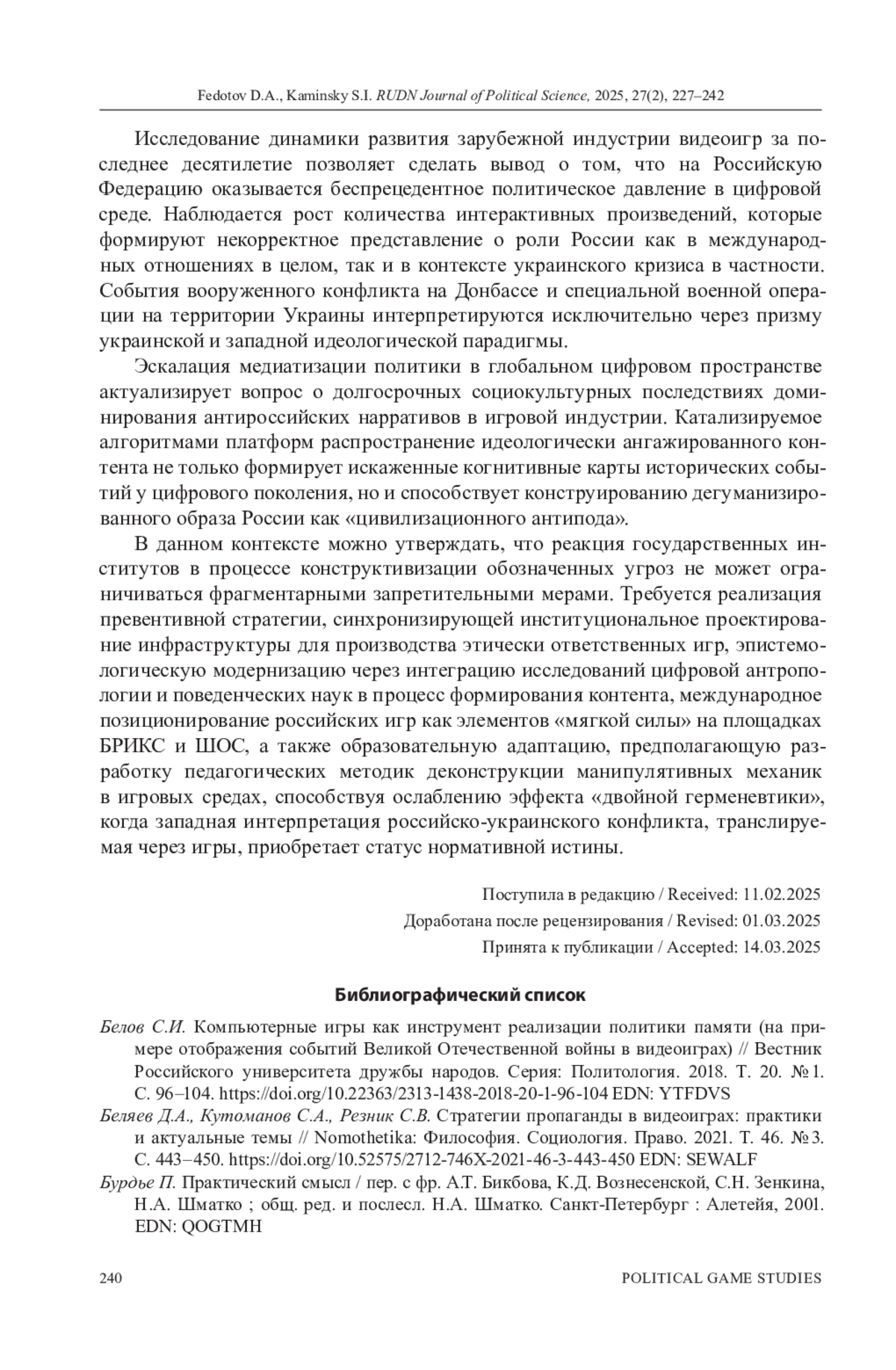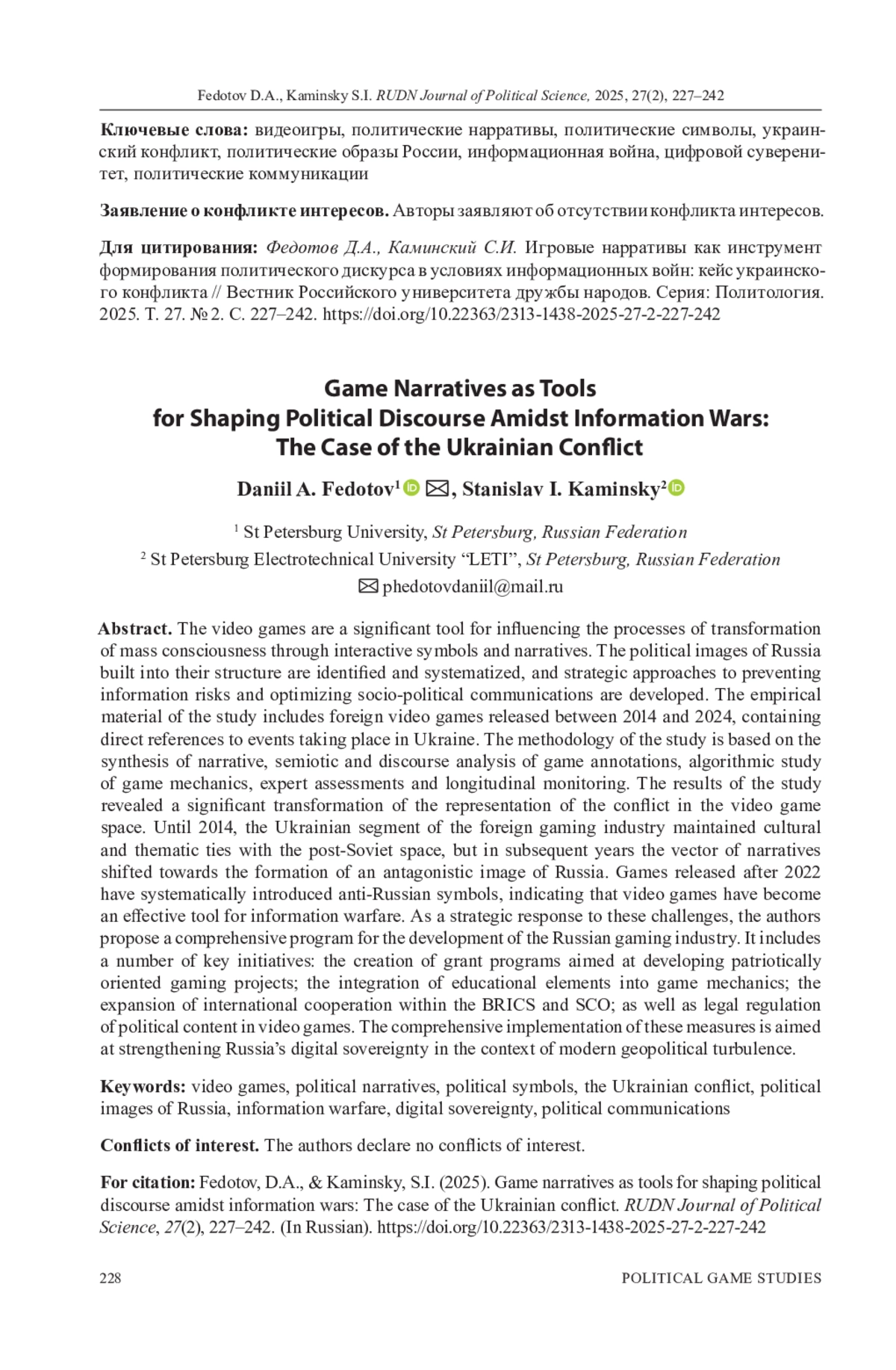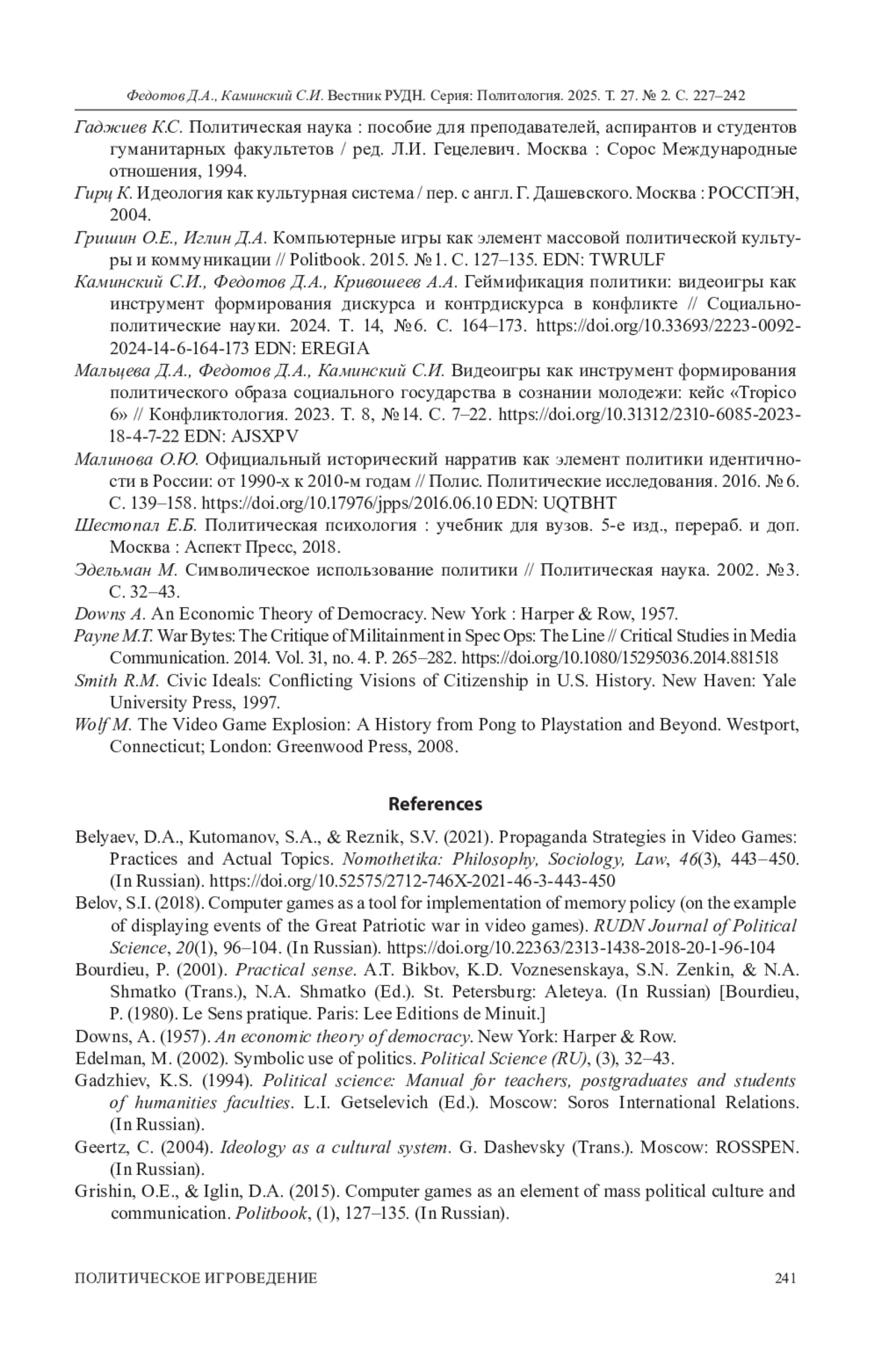 7. Каминский С.И., Федотов Д.А., Кривошеев А.А. Геймификация политики: видеоигры как инструмент формирования дискурса и контрдискурса в конфликте // Социально-политические науки. 2024. Т. 14, № 6. С. 164-173. DOI: 10.33693/2223-0092-2024-14-6-164-173 EDN: EREGIA