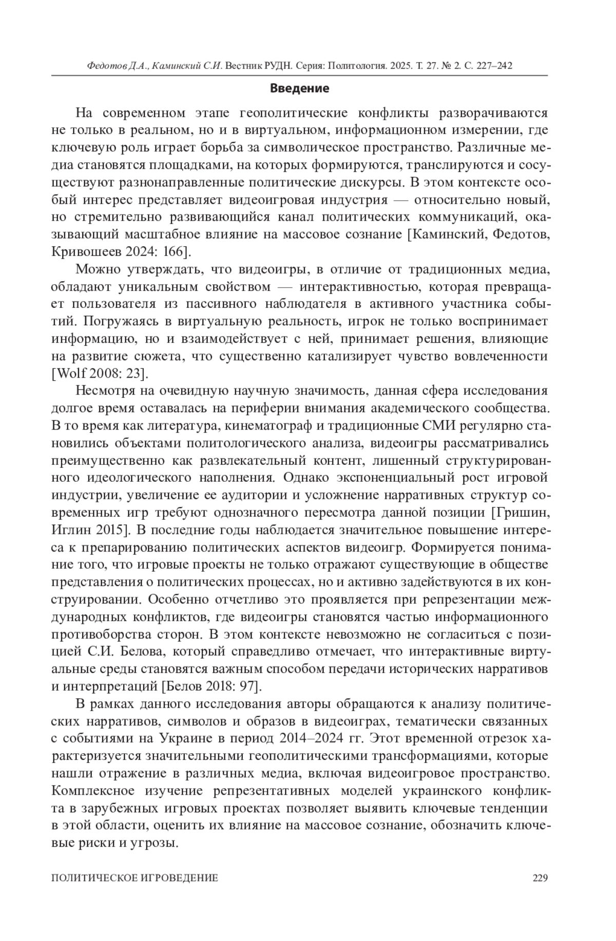 На современном этапе геополитические конфликты разворачиваются не только в реальном, но и в виртуальном, информационном измерении, где ключевую роль играет борьба за символическое пространство. Различные медиа становятся площадками, на которых формируются, транслируются и сосуществуют разнонаправленные политические дискурсы. В этом контексте особый интерес представляет видеоигровая индустрия — относительно новый, но стремительно развивающийся канал политических коммуникаций, оказывающий масштабное влияние на массовое сознание [Каминский, Федотов, Кривошеев 2024: 166].
