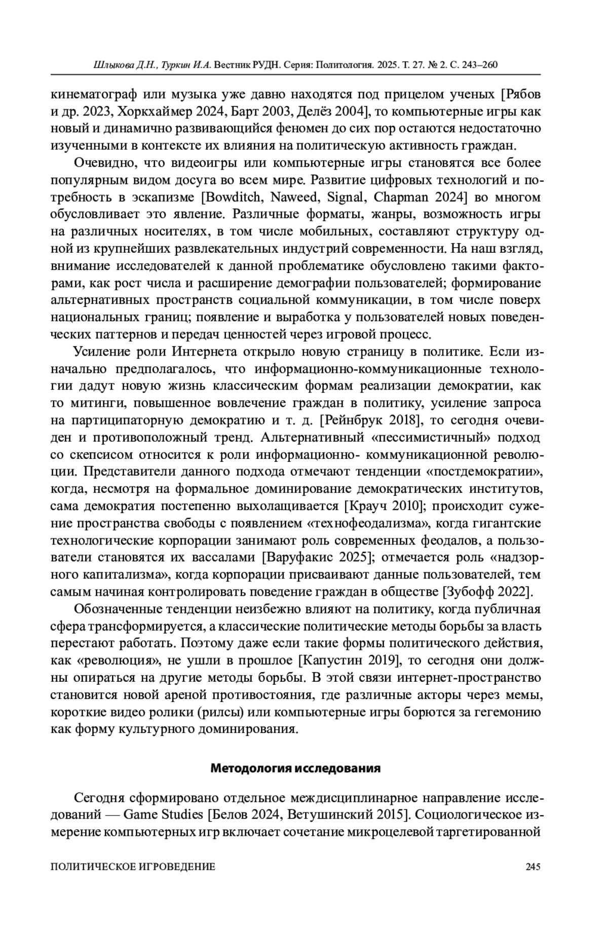Сегодня мы можем однозначно сказать, что массовая культура выступает одним из ключевых механизмов конструирования социальной реальности, формируя не только эстетические предпочтения общества, но и его политические взгляды, ценности и поведенческие паттерны. При этом необходимо отметить, что если традиционные формы массовой культуры, такие как новые медиа,кинематограф или музыка уже давно находятся под прицелом ученых [Рябов и др. 2023, Хоркхаймер 2024, Барт 2003, Делёз 2004], то компьютерные игры как новый и динамично развивающийся феномен до сих пор остаются недостаточно изученными в контексте их влияния на политическую активность граждан.