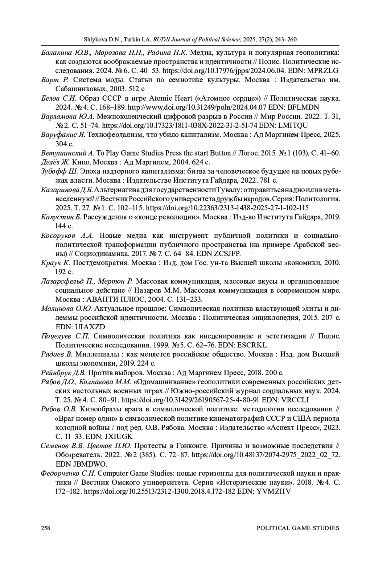 5. Белов С.И. Образ СССР в игре Atomic Heart (“Атомное сердце”) // Политическая наука. 2024. № 4. С. 168-189. http://www. DOI: 10.31249/poln/2024.04.07 EDN: BFLMDN