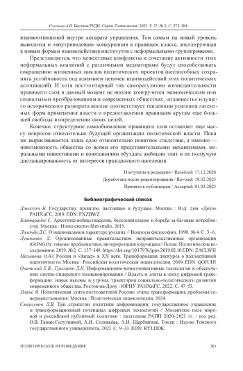 10. Соловьёв А.И. Механизмы политического господства или Как правит выигрышная коалиция // Полис. Политические исследования. 2024. № 2. С. 96-117. DOI: 10.17976/jpps/2024.02.08 EDN: CGFBMG