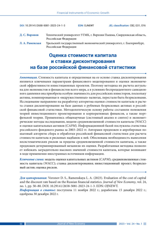 Стоимость капитала и определяемая на ее основе ставка дисконтирования являются ключевыми параметрами финансового моделирования и оценки экономической эффективности инвестиционных проектов. Поэтому методика их расчета актуальна для экономистов и финансистов всего мира, а в условиях беспрецедентного санкционного давления она приобрела особую значимость для российских инвесторов, поскольку активы, номинированные в «недружественных» валютах, перестали быть безрисковыми. Исследование направлено на разработку алгоритма оценки стоимости капитала и расчета ставки дисконтирования на базе данных о рублевых безрисковых активах и российской финансовой статистики. Методологическую основу работы составили положения теорий инвестиционного проектирования и корпоративных финансов, а также портфельной теории. Применялись общенаучные (системный анализ и синтез) и эконометрические методы исследования, модели средневзвешенной стоимости капитала (WACC) и оценки капитальных активов (CAPM). Информационной базой послужила статистика российского фондового рынка за 2003–2022 гг. Авторами предложен и апробирован пошаговый алгоритм сбора и обработки российской финансовой статистики для расчета стоимости капитала и рисковых надбавок к ней. Обоснована необходимость вынесения несистематических рисков за пределы средневзвешенной стоимости капитала, а также предложен детерминированный механизм их оценки. Разработанная методика позволяет избежать заградительно высоких значений стоимости капитала, которые возникают в ходе применения иностранных источников информации