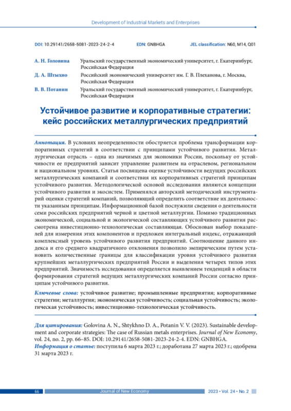 В условиях неопределенности обостряется проблема трансформации корпоративных стратегий в соответствии с принципами устойчивого развития. Металлургическая отрасль – одна из значимых для экономики России, поскольку от устойчивости ее предприятий зависит управление развитием на отраслевом, региональном и национальном уровнях. Статья посвящена оценке устойчивости ведущих российских металлургических компаний и соответствия их корпоративных стратегий принципам устойчивого развития. Методологической основой исследования являются концепции устойчивого развития и экосистем. Применялся авторский методический инструментарий оценки стратегий компаний, позволяющий определить соответствие их деятельности указанным принципам. Информационной базой послужили сведения о деятельности семи российских предприятий черной и цветной металлургии. Помимо традиционных экономической, социальной и экологической составляющих устойчивого развития рассмотрена инвестиционно-технологическая составляющая. Обоснован выбор показателей для измерения этих компонентов и предложен интегральный индекс, отражающий комплексный уровень устойчивого развития предприятий. Соотношение данного индекса и его среднего квадратичного отклонения позволило эмпирическим путем установить количественные границы для классификации уровня устойчивого развития крупнейших металлургических предприятий России и выделения четырех типов этих предприятий. Значимость исследования определяется выявлением тенденций в области формирования стратегий ведущих металлургических компаний России согласно принципам устойчивого развития