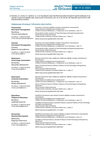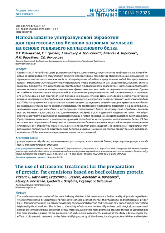 АТАКИШИЕВА В. Г., ГРЕСЕВА Е. Г., БОРИСЕНКО А. А., БАРЫБИНА Л. И., БЕЛОУСОВА Е. В. ИСПОЛЬЗОВАНИЕ УЛЬТРАЗВУКОВОЙ ОБРАБОТКИ ДЛЯ ПРИГОТОВЛЕНИЯ БЕЛКОВО-ЖИРОВЫХ ЭМУЛЬСИЙ НА ОСНОВЕ ГОВЯЖЬЕГО КОЛЛАГЕНОВОГО БЕЛКА // ИНДУСТРИЯ ПИТАНИЯ. 2025. Т. 10 № 2