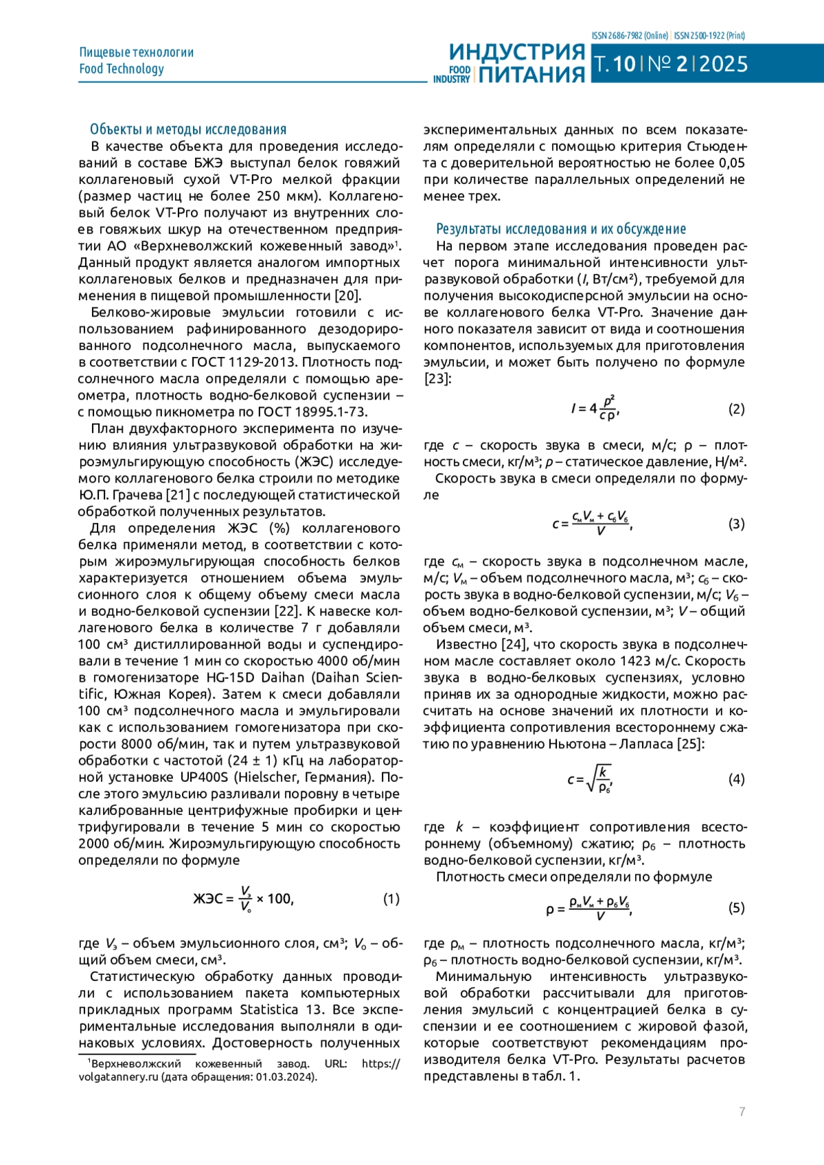 Статья: ИСПОЛЬЗОВАНИЕ УЛЬТРАЗВУКОВОЙ ОБРАБОТКИ ДЛЯ ПРИГОТОВЛЕНИЯ БЕЛКОВО-ЖИРОВЫХ ЭМУЛЬСИЙ НА ОСНОВЕ ГОВЯЖЬЕГО КОЛЛАГЕНОВОГО БЕЛКА (2025)