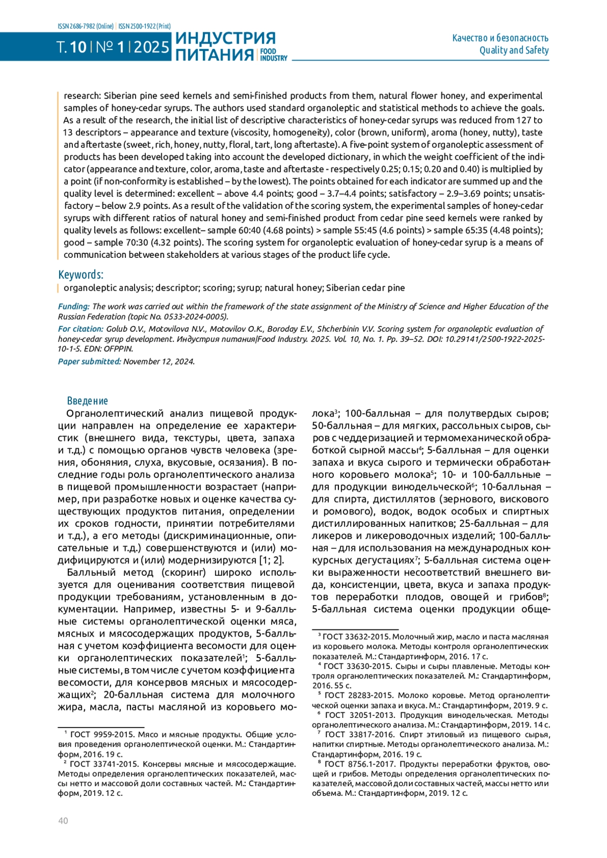 Органолептический анализ обеспечивает понимание и оценку восприятия человеком характеристик пищевой продукции, при этом существует ограниченное количество исследований, направленных на создание органолептических методов оценки качества продуктов переработки меда натурального и семян сосны кедровой. Цели работы – создание словаря органолептических показателей медово-кедровых сиропов и разработка балльной системы органолептической оценки медово-кедровых сиропов. Объекты исследований: ядра семян сосны кедровой сибирской и полуфабрикаты из них, мед натуральный цветочный, опытные образцы медово-кедровых сиропов. Для достижения поставленных целей использовали стандартные органолептические и статистические методы. В результате проведенных исследований первоначальный список описательных характеристик медово-кедровых сиропов сократили со 127 до 13 дескрипторов – внешнего вида и текстуры (вязкость, гомогенность), цвета (коричневый, однородный), аромата (медовый, ореховый), вкуса и послевкусия (сладкий, насыщенный, медовый, ореховый, цветочный, терпкий, длительное послевкусие). Разработана пятибалльная система органолептической оценки продукции с учетом разработанного словаря, при которой коэффициент весомости показателя (внешнего вида и текстуры, цвета, аромата, вкуса и послевкусия – соответственно 0,25; 0,15; 0,20 и 0,40) умножается на балл (при установлении несоответствия – на наименьший); полученные по каждому показателю баллы суммируются и определяется уровень качества: отличный – выше 4,4 балла; хороший – 3,7–4,4 балла; удовлетворительный – 2,9–3,69 балла; неудовлетворительный – ниже 2,9 балла. В результате валидации балльной системы опытные образцы медово-кедровых сиропов с разным соотношением меда натурального и полуфабриката из ядер семян сосны кедровой ранжированы по уровням качества следующим образом: отличный – образец 60:40 (4,68 балла) > образец 55:45 (4,6 балла) > образец 65:35 (4,48 балла); хороший – образец 70:30 (4,32 балла). Балльная система органолептической оценки медово-кедрового сиропа представляет собой средство коммуникации между заинтересованными сторонами на различных этапах жизненного цикла продукции.