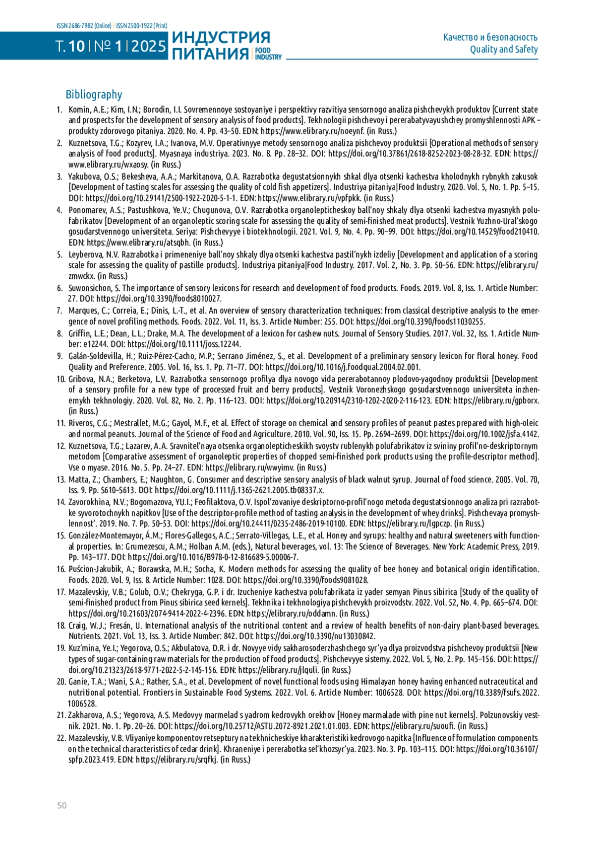 1. Комин А.Э., Ким И.Н., Бородин И.И. Современное состояние и перспективы развития сенсорного анализа пищевых продуктов // Технологии пищевой и перерабатывающей промышленности АПК - продукты здорового питания. 2020. № 4. С. 43-50. EDN: NOEYNF