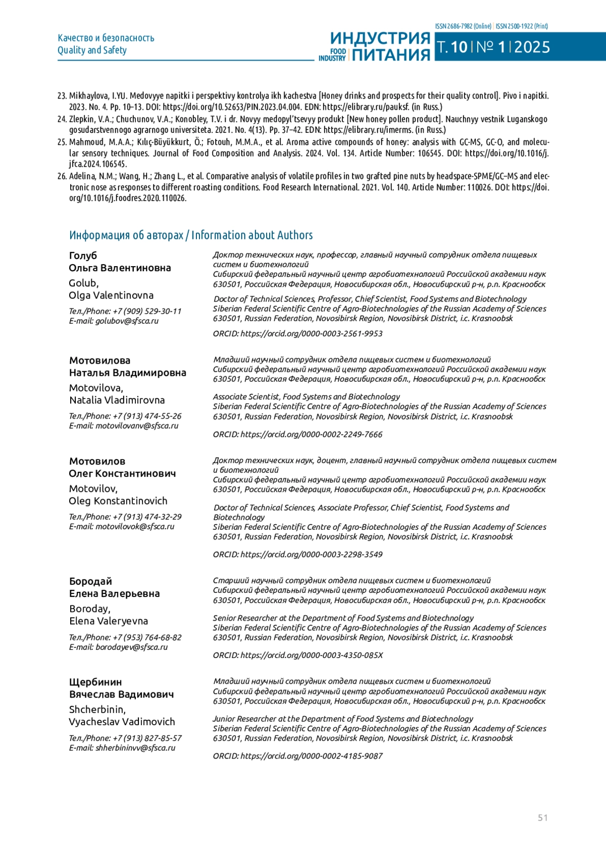 25. Mahmoud, M.A.A.; Kılıç-Büyükkurt, Ö.; Fotouh, M.M.A., et al. Aroma active compounds of honey: analysis with GC-MS, GC-O, and molecular sensory techniques. Journal of Food Composition and Analysis. 2024. Vol. 134. Article Number: 106545. DOI: 10.1016/j.jfca.2024.106545