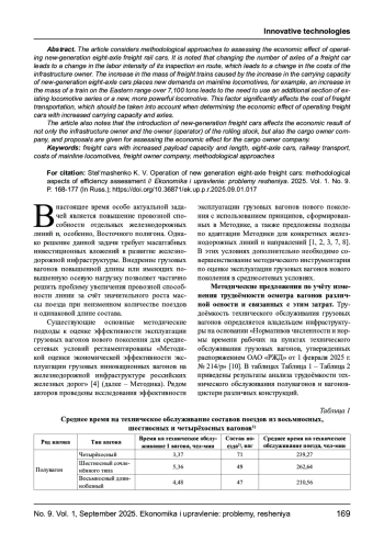 В статье рассматриваются методические подходы к оценке экономического эффекта от эксплуатации грузовых железнодорожных восьмиосных вагонов нового поколения. Отмечено, что изменение количества осей грузового вагона приводит к изменению трудоёмкости его осмотра в пути следования, что приводит к изменению расходов владельца инфраструктуры. Повышение массы грузовых поездов, вызванное увеличением грузоподъёмности восьмиосных вагонов нового поколения, предъявляет новые требования к магистральным локомотивам, так, увеличение массы поезда на Восточном полигоне свыше 7100 т приводит к необходимости использовать дополнительную секцию существующих серий локомотива или новый, более мощный локомотив. Этот фактор существенно влияет на себестоимость грузовых перевозок, что целесообразно учитывать при определении экономического эффекта от эксплуатации грузовых вагонов повышенной грузоподъёмности и осности. Также в статье отмечается, что внедрение грузовых вагонов нового поколения оказывает влияние на экономический результат не только владельца инфраструктуры и владельца (оператора) подвижного состава, но и компании-грузовладельца, приводятся предложения по оценке экономического эффекта для компании-грузовладельца.
