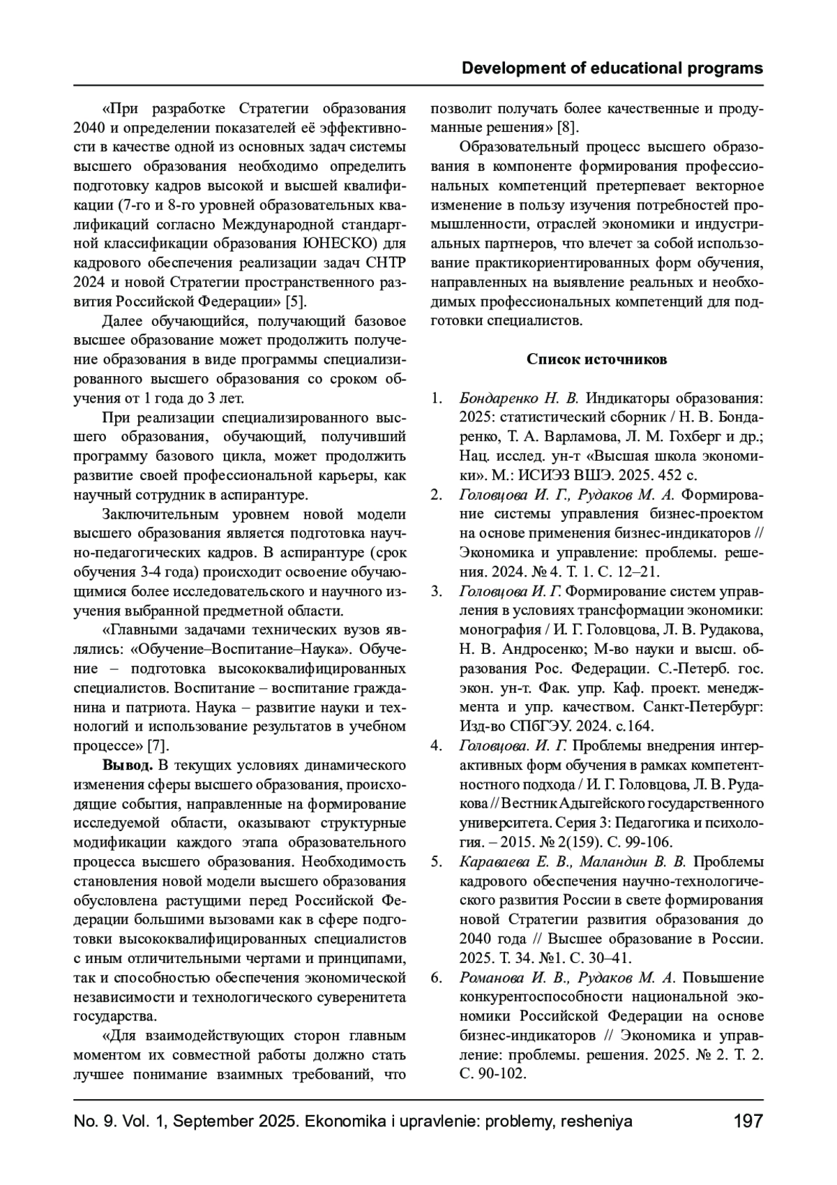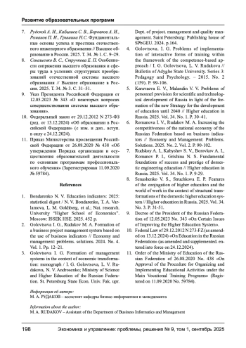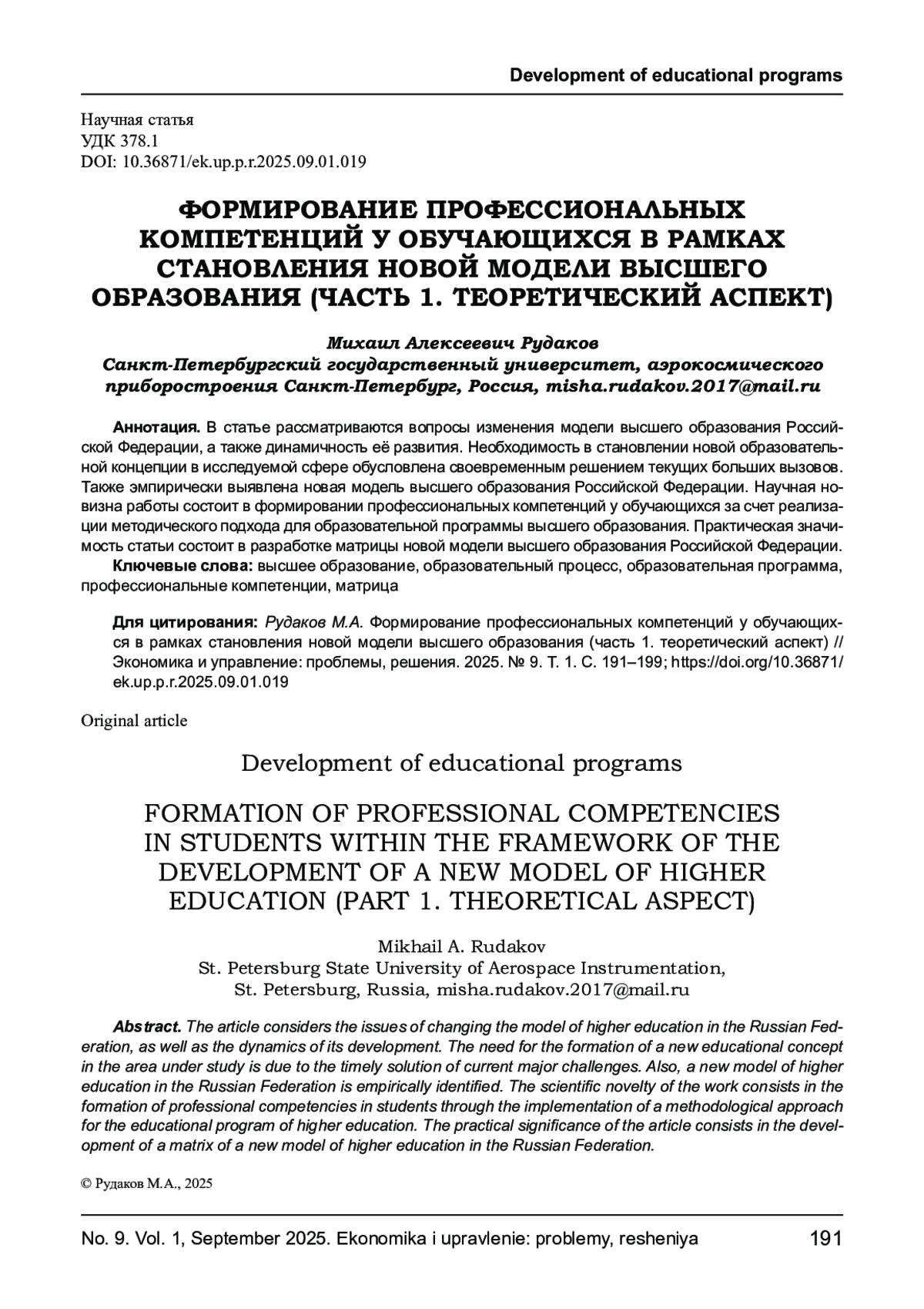 РУДАКОВ М. А. ФОРМИРОВАНИЕ ПРОФЕССИОНАЛЬНЫХ КОМПЕТЕНЦИЙ У ОБУЧАЮЩИХСЯ В РАМКАХ СТАНОВЛЕНИЯ НОВОЙ МОДЕЛИ ВЫСШЕГО ОБРАЗОВАНИЯ (ЧАСТЬ 1. ТЕОРЕТИЧЕСКИЙ АСПЕКТ) // ЭКОНОМИКА И УПРАВЛЕНИЕ: ПРОБЛЕМЫ, РЕШЕНИЯ. 2025. ТОМ 1 № 9