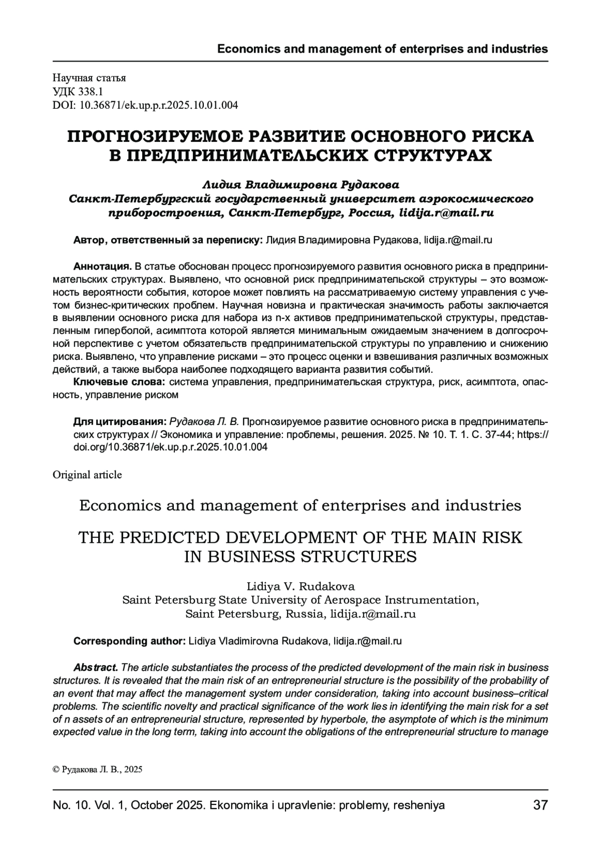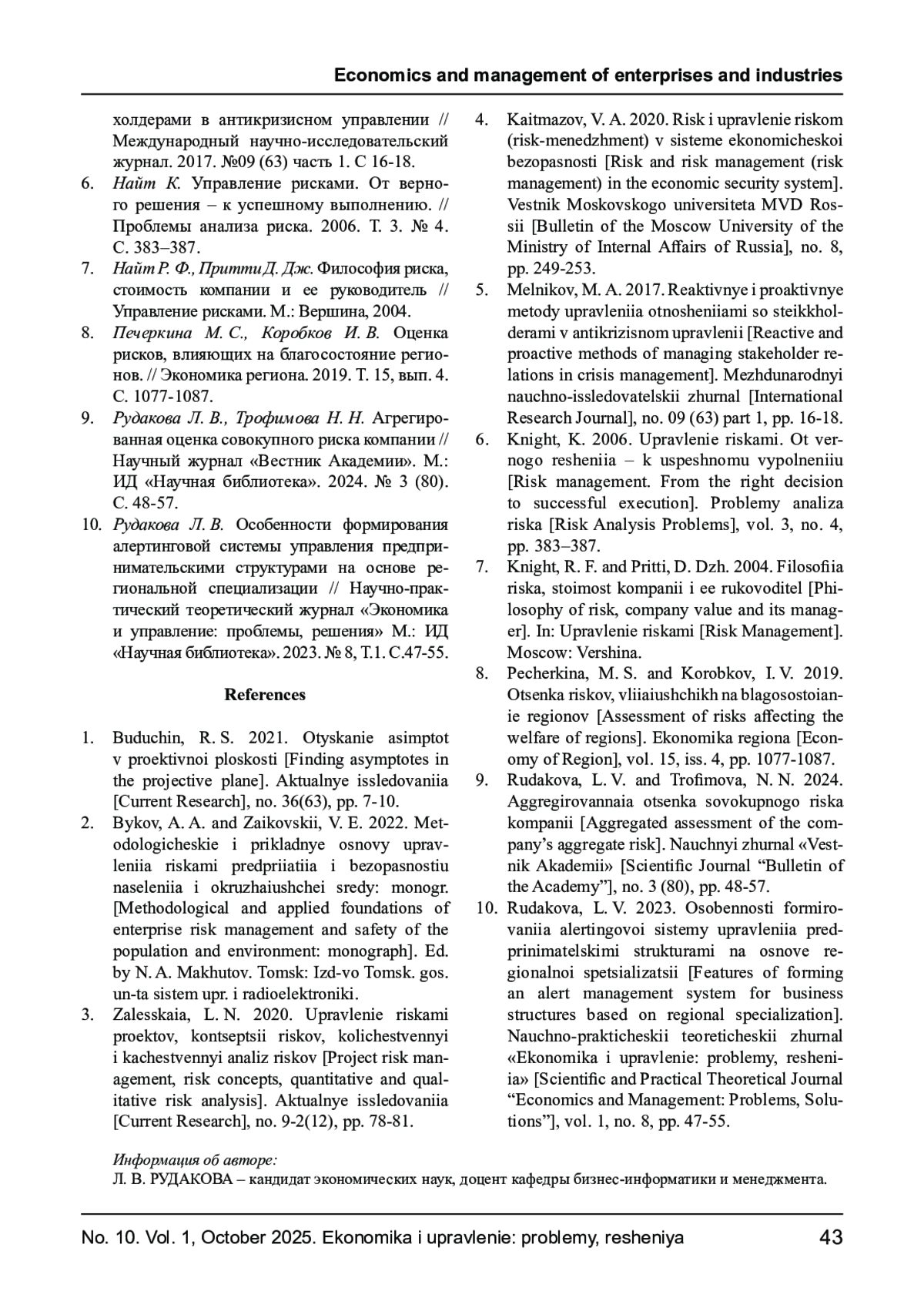 10. Рудакова Л. В. Особенности формирования алертинговой системы управления предпринимательскими структурами на основе региональной специализации // Научно-практический теоретический журнал “Экономика и управление: проблемы, решения” М.: ИД “Научная библиотека”. 2023. № 8, Т.1. С.47-55.