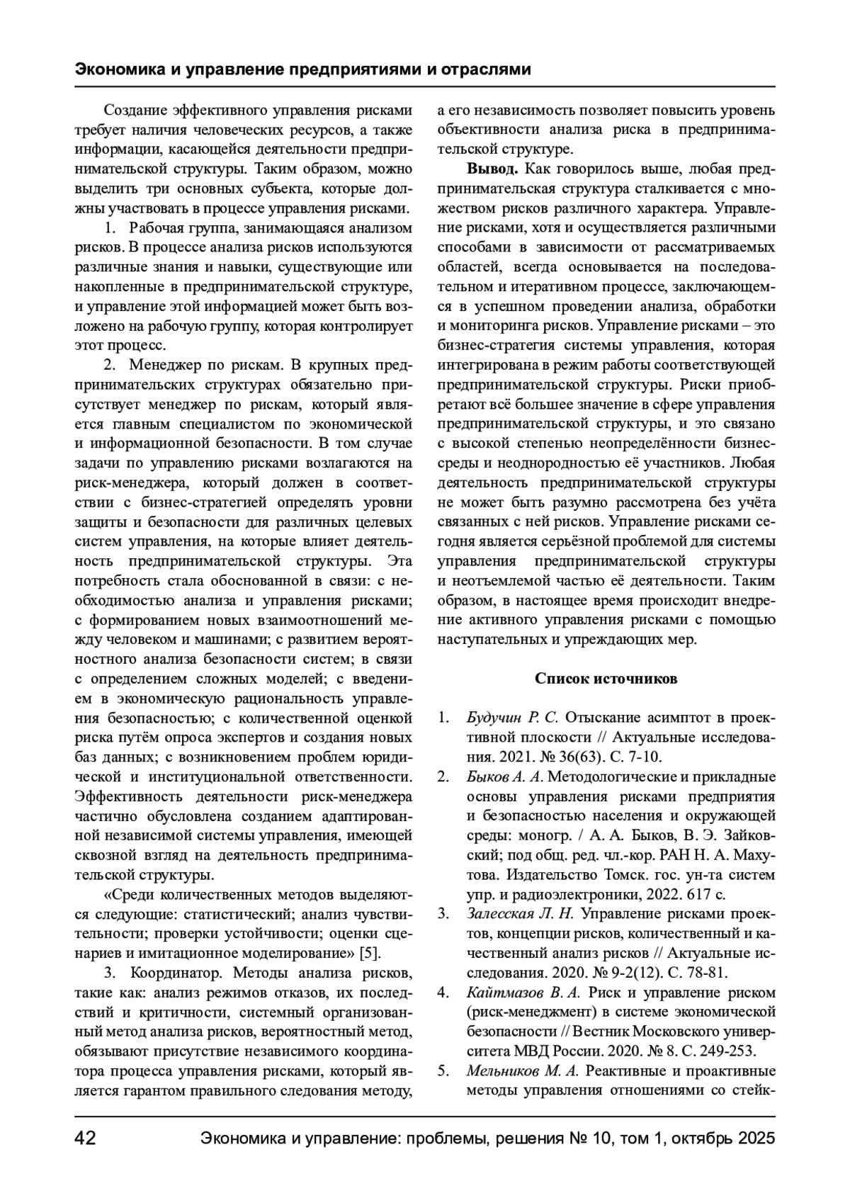4. Кайтмазов В. А. Риск и управление риском (риск-менеджмент) в системе экономической безопасности // Вестник Московского университета МВД России. 2020. № 8. С. 249-253.