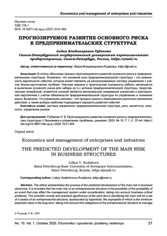 В статье обоснован процесс прогнозируемого развития основного риска в предпринимательских структурах. Выявлено, что основной риск предпринимательской структуры - это возможность вероятности события, которое может повлиять на рассматриваемую систему управления с учетом бизнес-критических проблем. Научная новизна и практическая значимость работы заключается в выявлении основного риска для набора из n-х активов предпринимательской структуры, представленным гиперболой, асимптота которой является минимальным ожидаемым значением в долгосрочной перспективе с учетом обязательств предпринимательской структуры по управлению и снижению риска. Выявлено, что управление рисками - это процесс оценки и взвешивания различных возможных действий, а также выбора наиболее подходящего варианта развития событий.