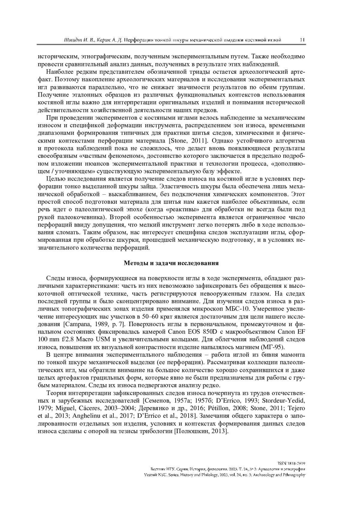11. Шмидт И. В., Ковальченко Е. А. Результаты эксперимента по использованию костяной иглы для перфорации шкуры грубой выделки // Вестник НГУ. Серия: История, филология. 2022. Т. 21, № 5. С. 20-31.