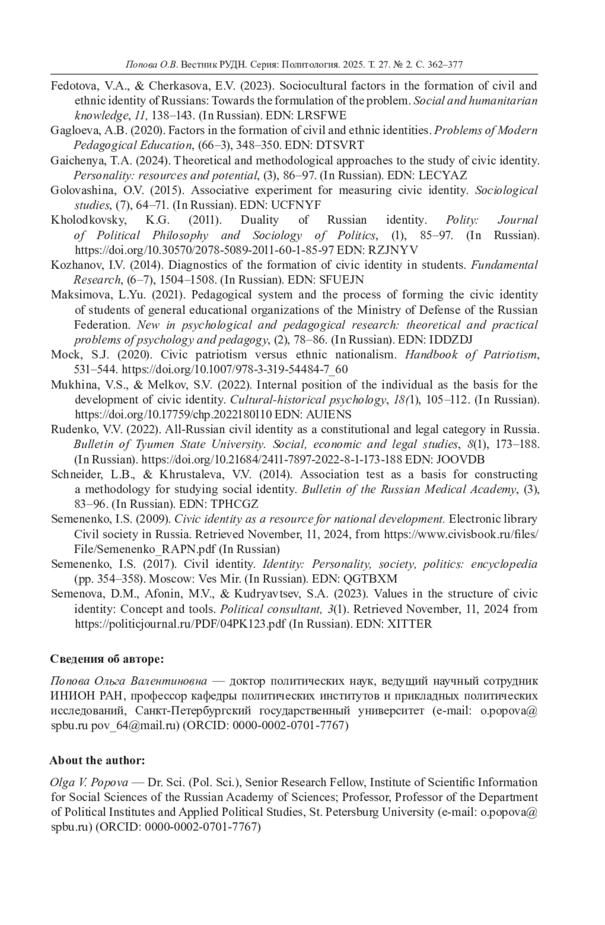 19. Федотова В.А. Гражданская и этническая идентичность россиян: роль ценностей в их формировании // Вестник Московского университета. Серия 14. Психология. 2024. Т. 47, № 1. С. 131-149. 10.11621/ LPJ-24-06. DOI: 10.11621/LPJ-24-06 EDN: CDOTEQ
