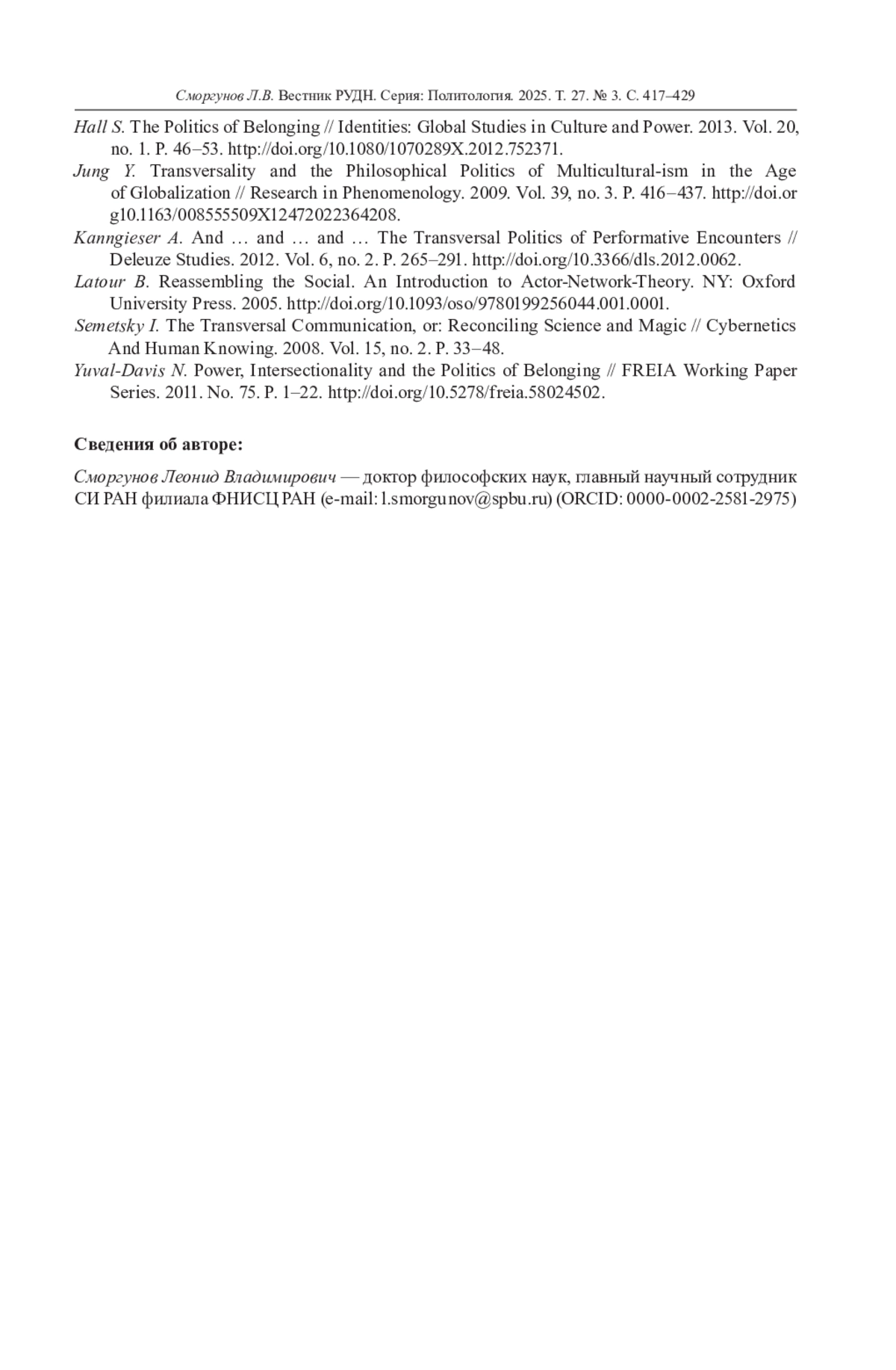 16. Jung Y. Transversality and the Philosophical Politics of Multicultural-ism in the Age of Globalization // Research in Phenomenology. 2009. Vol. 39, no. 3. P. 416-437. http://doi.org. DOI: 10.1163/008555509X12472022364208