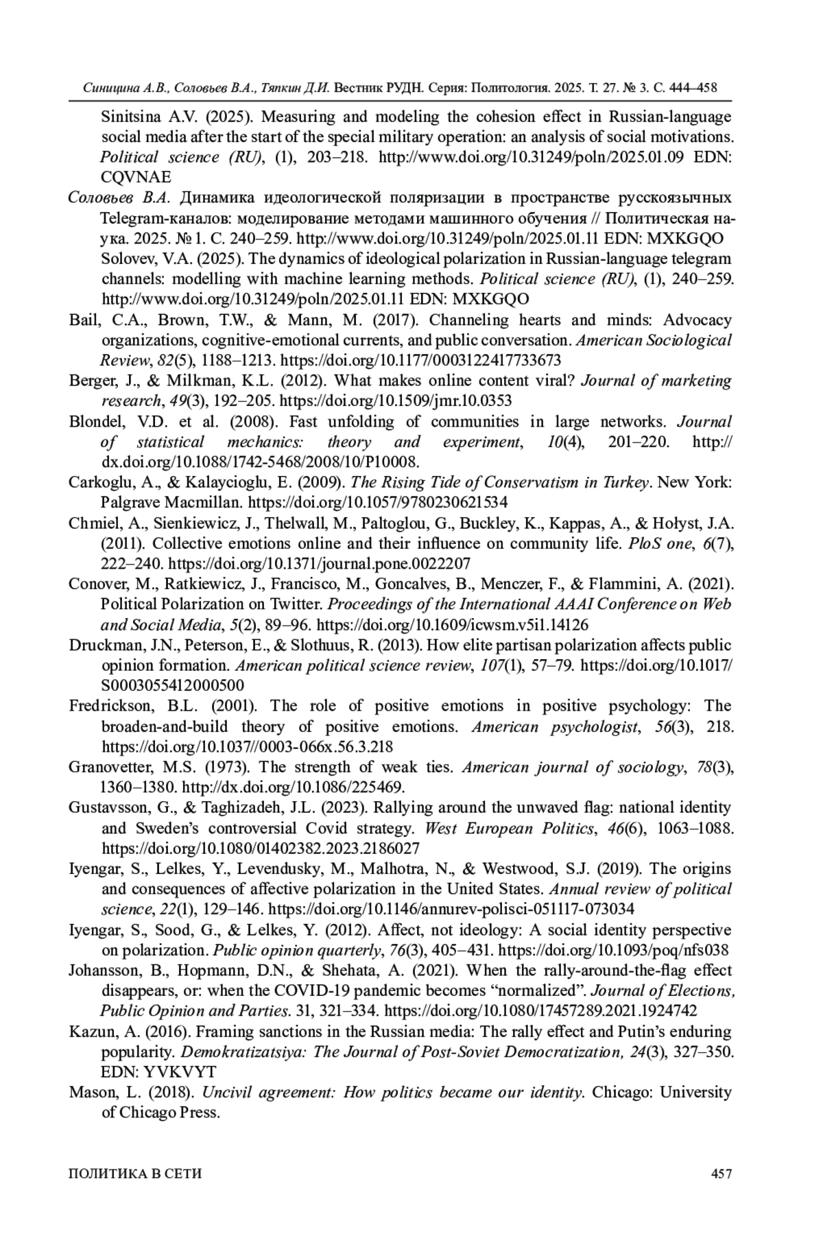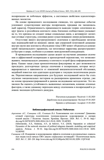 1. Ахременко А.С., Синицина А.В., Соловьев В.А. Размежевание или сплочение? Динамика сетевой структуры политических телеграм-каналов: моделирование и эмпирический анализ // Полития: Анализ. Хроника. Прогноз. 2024. № 3. С. 59-81. ;. DOI: 10.30570/2078-5089-2024-114-3-59-81 EDN: VLMIWE