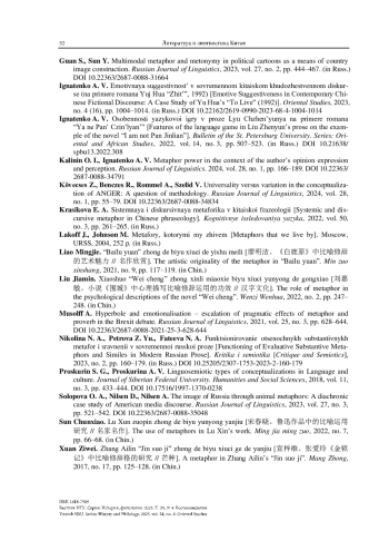 9. Красикова Е. А. Системная и дискурсивная метафорика в китайской фразеологии // Когнитивные исследования языка. 2022. Т. 50, № 3. С. 261-265.
