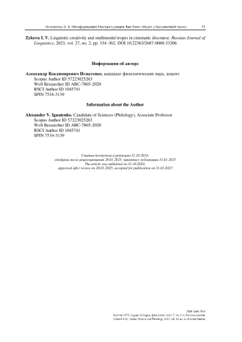 21. Zykova I. V. Linguistic creativity and multimodal tropes in cinematic discourse // Russian Journal of Linguistics. 2023. Vol. 27, no. 2. P. 334-362. https://doi.org/10.22363/2687-0088-33206