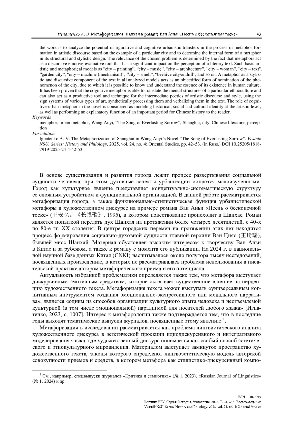 Статья посвящена исследованию метафоризации города как культурно-семиотического пространства на примере Шанхая в романе Ван Аньи «Песнь о бесконечной тоске» (王安忆 《长恨歌》, 1995). Цель работы – проанализировать потенциал образно-когнитивных урбанистических переносов в процессе метафорообразования в художественном дискурсе на примере конкретного города и определить внутреннюю форму метафоры в ее структурно-стилистическом оформлении. Актуальность избранной проблематики определяется тем, что метафора выступает дискурсивным эмотивно-оценочным средством, которое оказывает существенное влияние на перцепцию художественного текста. В работе рассматриваются такие основные когнитивные художественно-метафорические модели, как «город – картина / полотно», «город – музыка», «город – архитектура», «город – текст», «город – женщина», «город – сад», «город – машина (механизм)», «город – запах», «город – улей / муравейник» и др. Метафора как стилистико-дискурсивный компонент текста во всех анализируемых моделях выступает объективированной формой номинации феномена города, благодаря которой можно познавать и понимать суть его существования в человеческой культуре. Доказывается, что когнитивная метафора способна транслировать ментальные структуры конкретной этнокультуры, а также может выступать продуктивным инструментом и приемом интермедиальной поэтики художественного дискурса и стиля, используя знаковые системы различных видов искусства, синтетически обрабатывая их и вербализуя в тексте. Роль когнитивно-урбанистической метафоры в романе рассматривается в качестве моделирования исторической, социальной и культурологической идентичности на художественном уровне, а также выполнения объяснительной функции важного для китайской истории периода читателю.