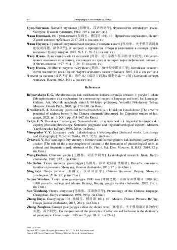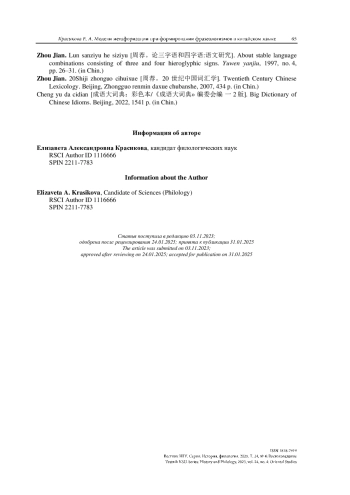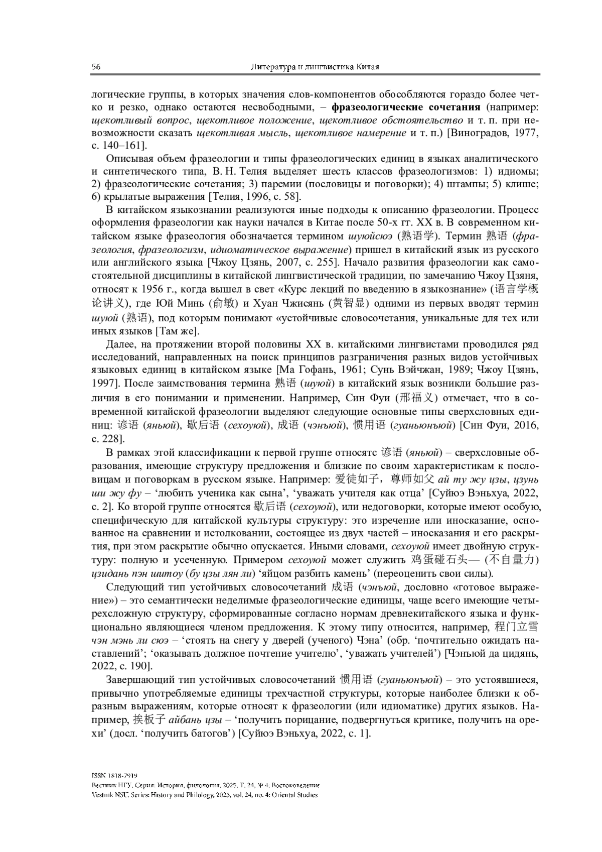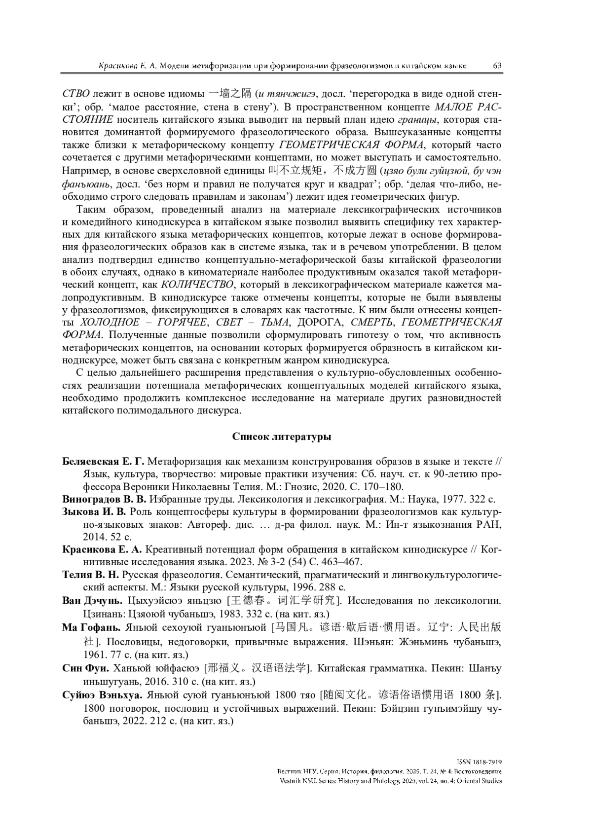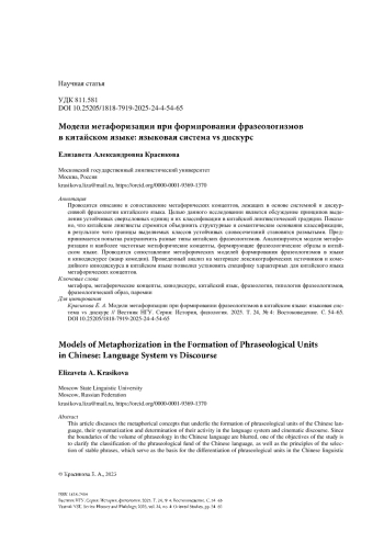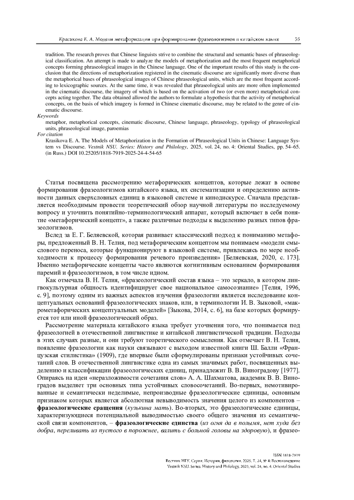 КРАСИКОВА Е. А. МОДЕЛИ МЕТАФОРИЗАЦИИ ПРИ ФОРМИРОВАНИИ ФРАЗЕОЛОГИЗМОВ В КИТАЙСКОМ ЯЗЫКЕ: ЯЗЫКОВАЯ СИСТЕМА VS ДИСКУРС // ВЕСТНИК НГУ. СЕРИЯ: ИСТОРИЯ, ФИЛОЛОГИЯ. 2025. ТОМ 24, № 4