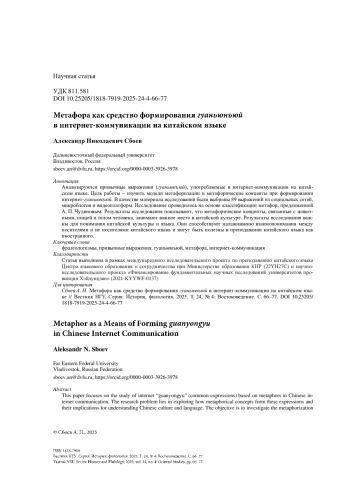 Анализируются привычные выражения (гуаньюнъюй), употребляемые в интернет-коммуникации на китайском языке. Цель работы – изучить модели метафоризации и метафорические концепты при формировании интернет-гуаньюнъюй. В качестве материала исследования были выбраны 89 выражений из социальных сетей, микроблогов и видеоплатформ. Исследование проводилось на основе классификации метафор, предложенной А. П. Чудиновым. Результаты исследования показывают, что метафорические концепты, связанные с животными, пищей и телом человека, занимают важное место в китайской культуре. Результаты исследования важны для понимания китайской культуры и языка. Они способствуют налаживанию взаимопонимания между носителями и не носителями китайского языка и могут быть полезны в преподавании китайского языка как иностранного.