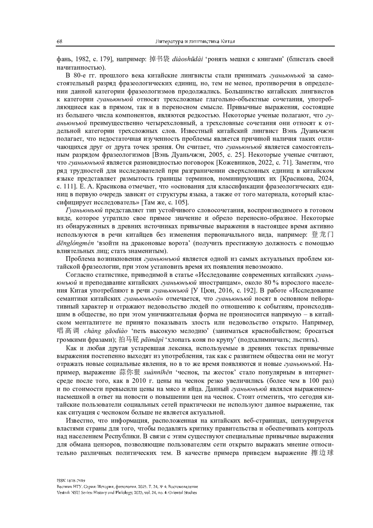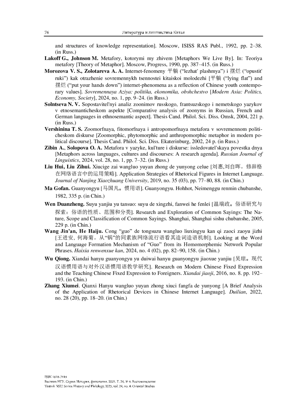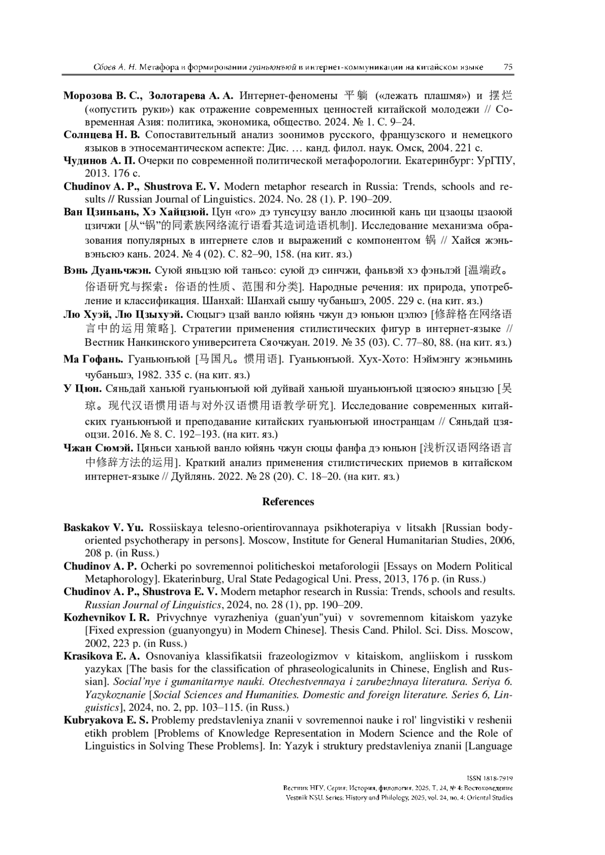 СБОЕВ А. Н. МЕТАФОРА КАК СРЕДСТВО ФОРМИРОВАНИЯ ГУАНЬЮНЪЮЙ В ИНТЕРНЕТ-КОММУНИКАЦИИ НА КИТАЙСКОМ ЯЗЫКЕ // ВЕСТНИК НГУ. СЕРИЯ: ИСТОРИЯ, ФИЛОЛОГИЯ. 2025. ТОМ 24, № 4