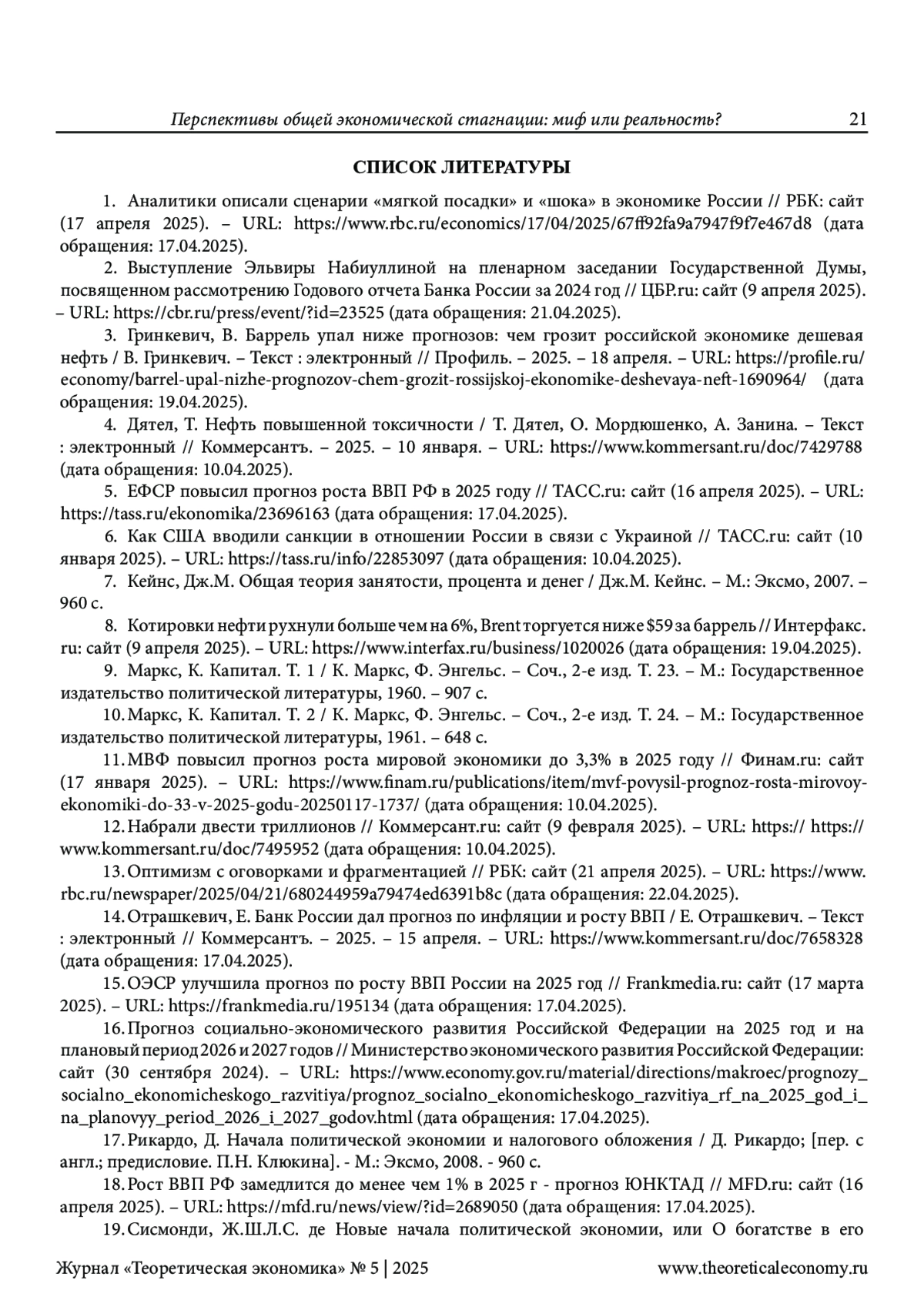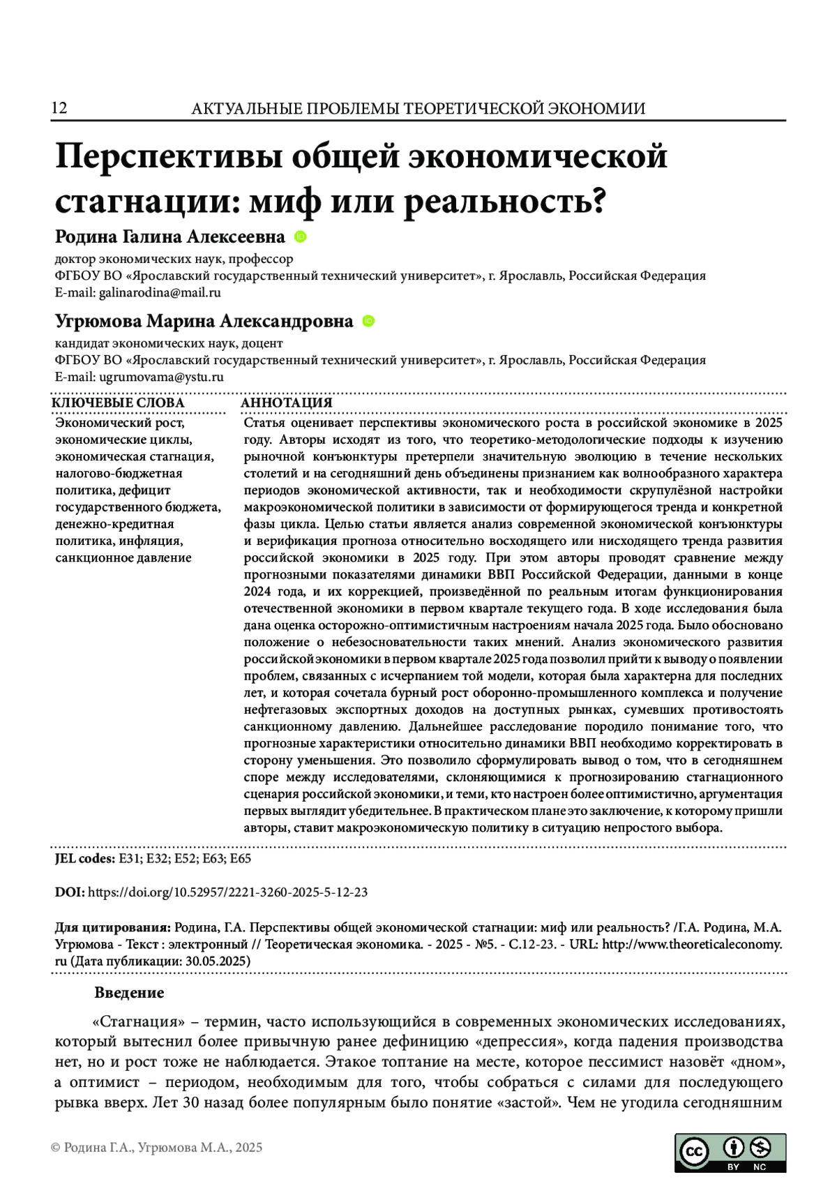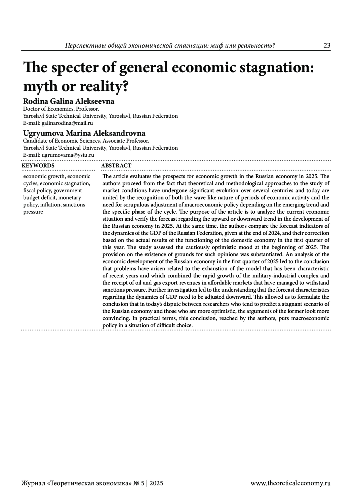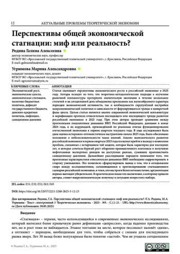 УГРЮМОВА М. А., РОДИНА Г. А. ПЕРСПЕКТИВЫ ОБЩЕЙ ЭКОНОМИЧЕСКОЙ СТАГНАЦИИ: МИФ ИЛИ РЕАЛЬНОСТЬ? // ТЕОРЕТИЧЕСКАЯ ЭКОНОМИКА. 2025. № 5 (125)