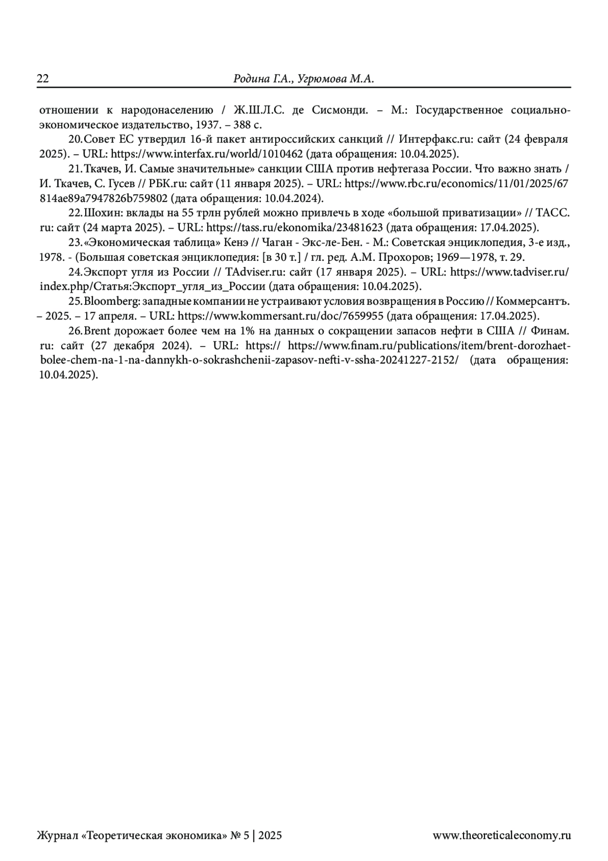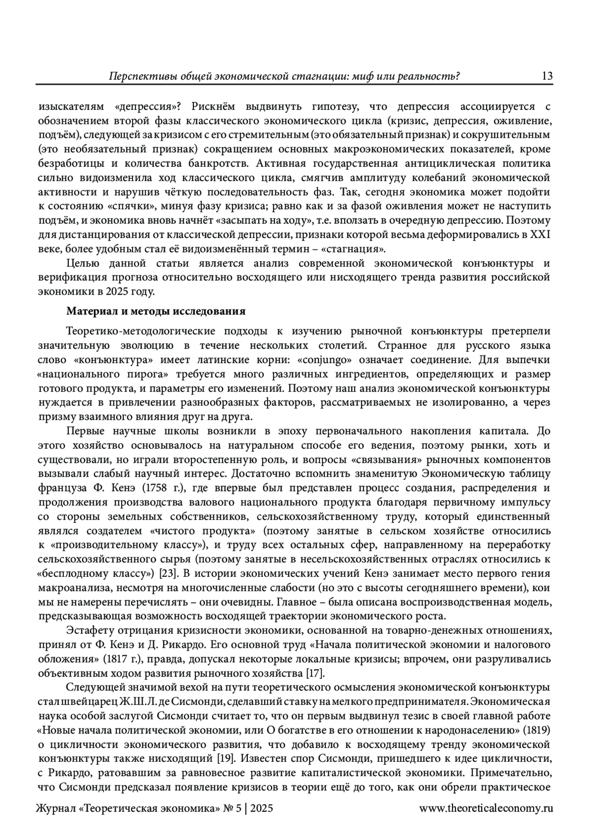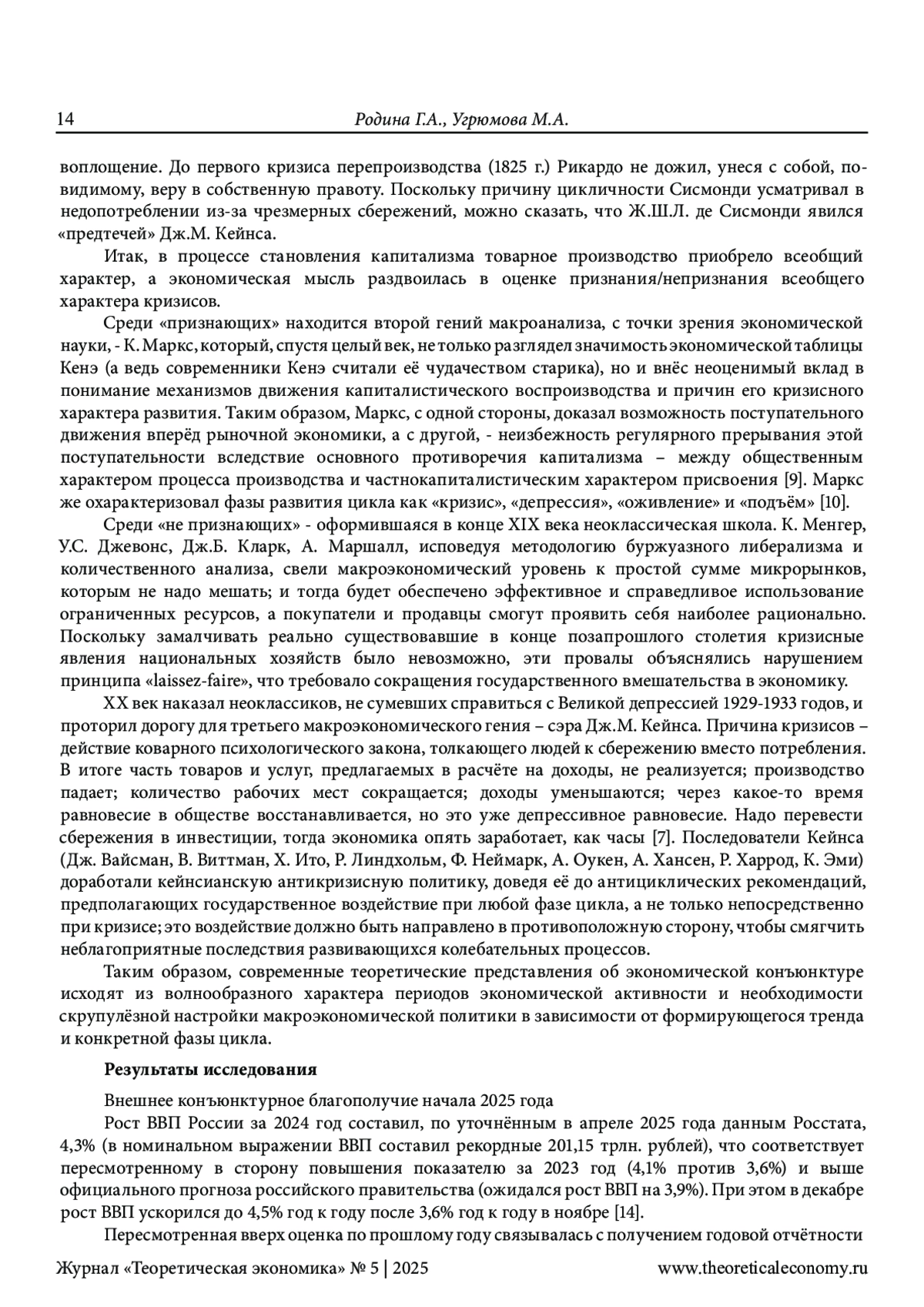 УГРЮМОВА М. А., РОДИНА Г. А. ПЕРСПЕКТИВЫ ОБЩЕЙ ЭКОНОМИЧЕСКОЙ СТАГНАЦИИ: МИФ ИЛИ РЕАЛЬНОСТЬ? // ТЕОРЕТИЧЕСКАЯ ЭКОНОМИКА. 2025. № 5 (125)