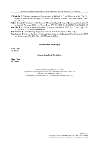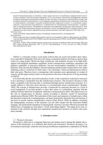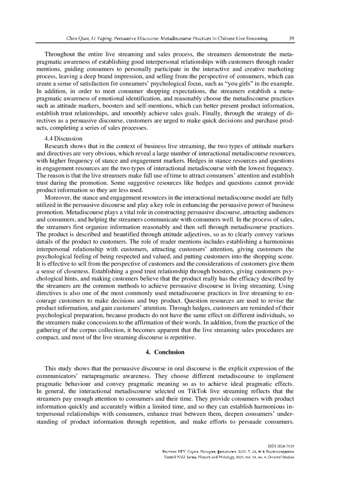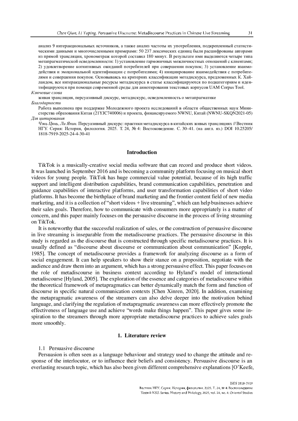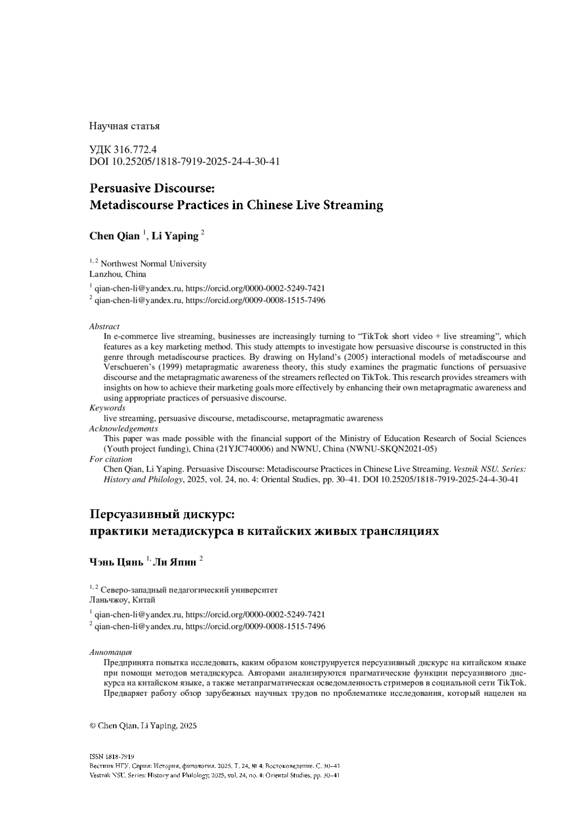 ЦЯНЬ Ч., ЯПИН Л. ПЕРСУАЗИВНЫЙ ДИСКУРС: ПРАКТИКИ МЕТАДИСКУРСА В КИТАЙСКИХ ЖИВЫХ ТРАНСЛЯЦИЯХ // ВЕСТНИК НГУ. СЕРИЯ: ИСТОРИЯ, ФИЛОЛОГИЯ. 2025. ТОМ 24, № 4