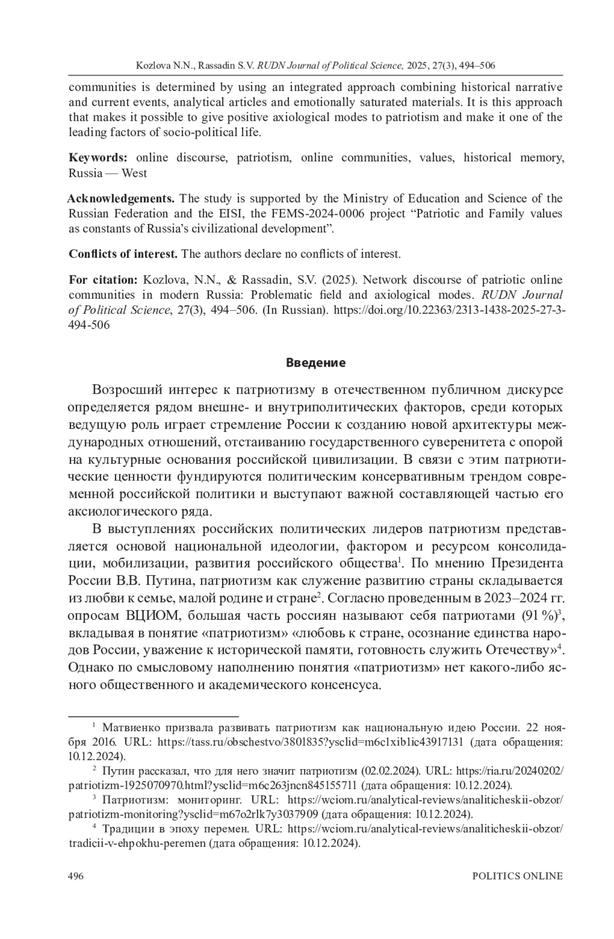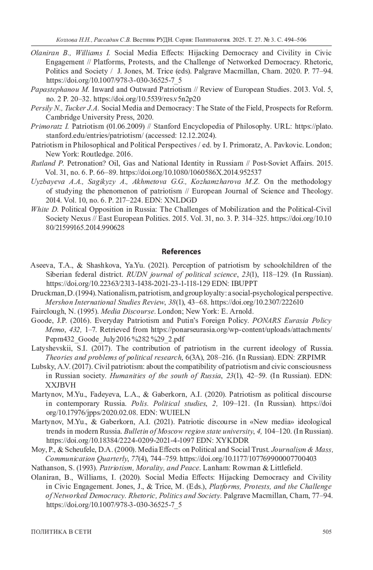 4. Мартынов М.Ю., Фадеева Л.А., Габеркорн А.И. Патриотизм как политический дискурс в современной России // Полис. Политические исследования. 2020. № 2. С. 109-121. DOI: 10.17976/jpps/2020.02.08 EDN: WUIELN
