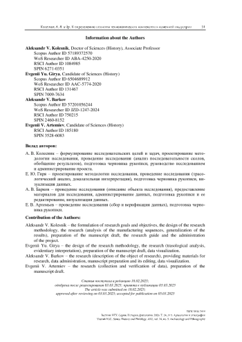 6. Гиря Е. Ю., Барков А. В., Хлопачев Г. А., Колесник А. В. Уникальное изделие из бивневого отщепа со стоянки верхнего палеолита Стрелка-1 (Красноярск) // Stratum plus. 2025. № 1. С. 315-331. https://doi.org/10.55086/sp251315331