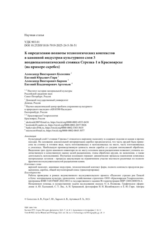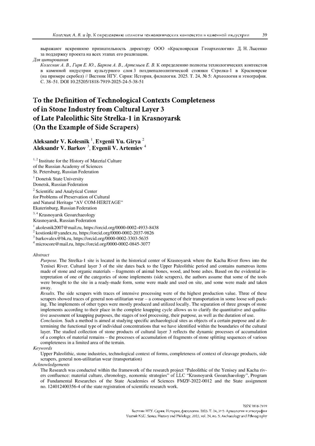 2. Барков А. В., Колесник А. В. Клад микропластин из позднепалеолитического слоя стоянки Стрелка-1 в Красноярске // // Вестник НГУ. Серия: История, филология. 2024. Т. 23, № 7: Археология и этнография. С. 73-84. https://doi.org/10.25205/1818-7919-2024-23-7-73-84
