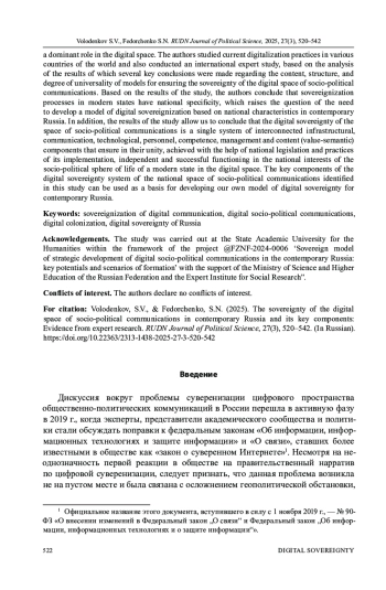 В условиях глобальных технологических трансформаций цифровой коммуникационной сферы актуализируется проблема обеспечения цифрового суверенитета современного государства. Особо важное значение данная проблема имеет в сфере общественно-политических коммуникаций, характеризующейся значительным потенциалом воздействия на массовое сознание и трансформации традиционных духовно-нравственных и ценностно-смысловых основ жизнедеятельности государства и общества. Дополнительную значимость обозначенная проблема приобретает для России, находящейся в настоящее время в ситуации геополитического противостояния с коллективным Западом, многие страны которого являются технологически развитыми державами, претендующими на доминирующую роль в цифровом пространстве. Авторами изучены актуальные практики цифровизации в различных государствах мира, а также проведено международное экспертное исследование, на основе анализа результатов которого было сделано несколько ключевых выводов относительно содержания, структуры и степени универсальности моделей обеспечения суверенитета цифрового пространства общественно-политических коммуникаций. По итогам работы авторы приходят к выводу о том, что процессы суверенизации в современных государствах обладают национальной спецификой, что ставит вопрос о необходимости разработки модели цифровой суверенизации на основе национальных особенностей и в современной России. Кроме того, результаты проведенного исследования позволяют сделать вывод о том, что цифровой суверенитет пространства общественно-политических коммуникаций представляет собой единую систему взаимосвязанных между собой инфраструктурных, коммуникационных, технологических, кадровых, компетентностных, управленческих и содержательных (ценностно-смысловых) компонентов, обеспечивающих в своем единстве, достигаемом при помощи национального законодательства и практик его реализации, независимое и успешное функционирование в национальных интересах общественно-политической сферы жизнедеятельности современного государства в цифровом пространстве. Выявленные в ходе исследования ключевые компоненты системы цифрового суверенитета национального пространства общественно-политических коммуникаций могут быть положены в основу разработки собственной модели цифровой суверенизации современной России.