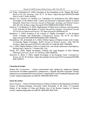 11. Никонов В.А., Воронов А.С., Сажина В.А., Володенков С.В., Рыбакова М.В. Цифровой суверенитет современного государства: содержание и структурные компоненты (по материалам экспертного исследования) // Вестник Томского государственного университета. Философия. Социология. Политология. 2021. № 60. С. 206-216. Х/60/18. DOI: 10.17223/1998863 EDN: PCWPLD