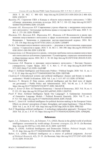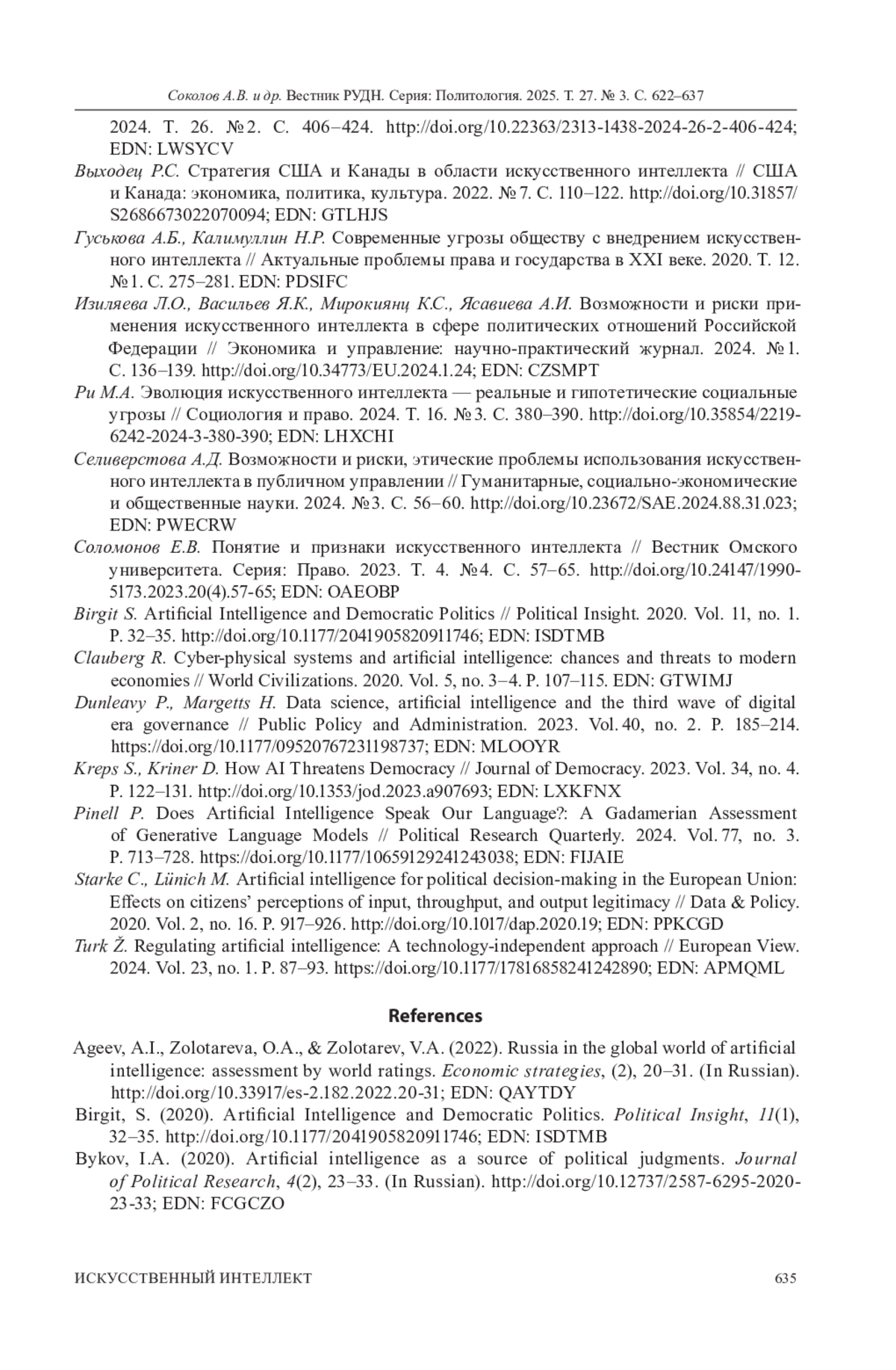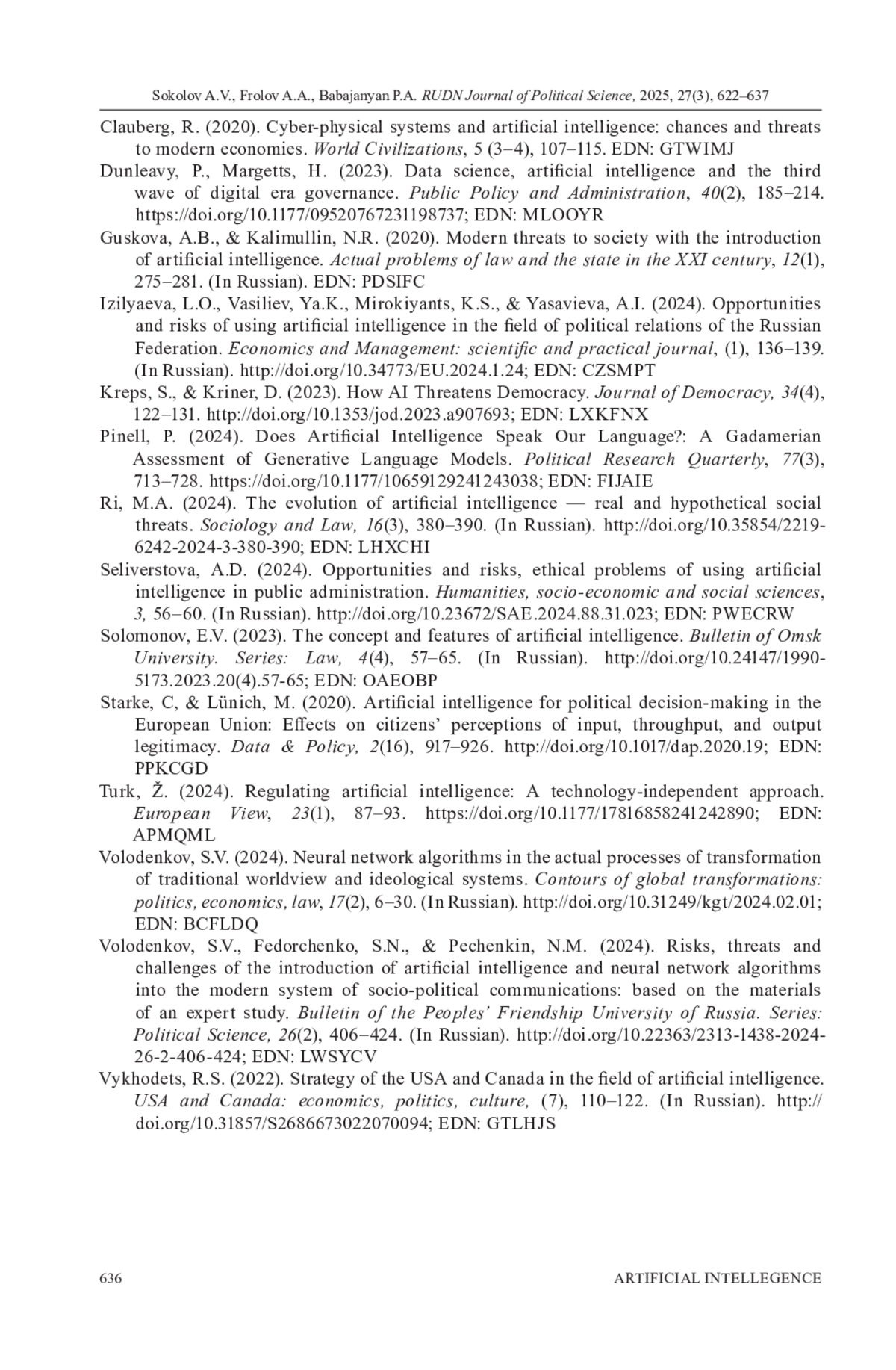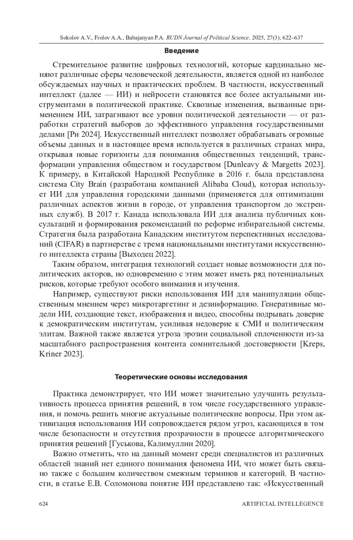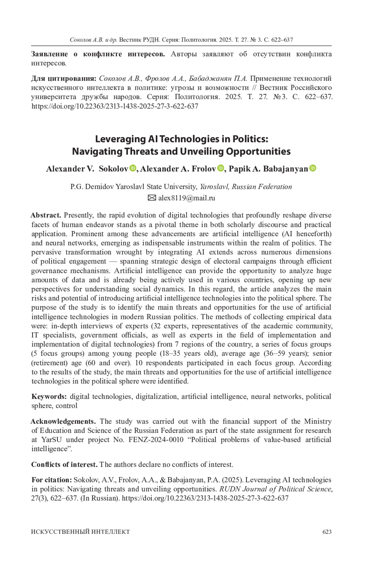 СОКОЛОВ А. В., ФРОЛОВ А. А., БАБАДЖАНЯН П. А. ПРИМЕНЕНИЕ ТЕХНОЛОГИЙ ИСКУССТВЕННОГО ИНТЕЛЛЕКТА В ПОЛИТИКЕ: УГРОЗЫ И ВОЗМОЖНОСТИ // ВЕСТНИК РОССИЙСКОГО УНИВЕРСИТЕТА ДРУЖБЫ НАРОДОВ. СЕРИЯ: ПОЛИТОЛОГИЯ. 2025. Т. 27 № 3