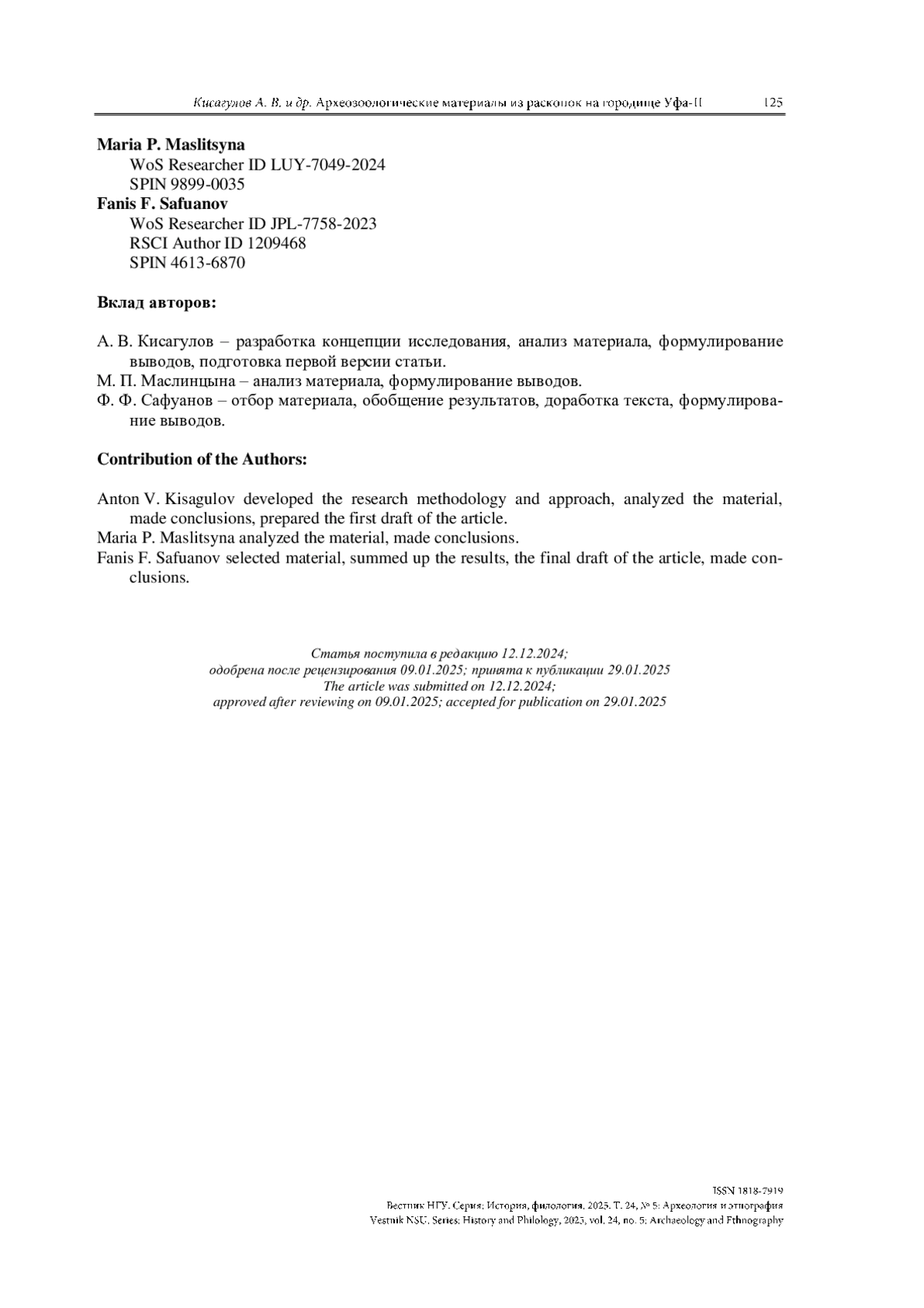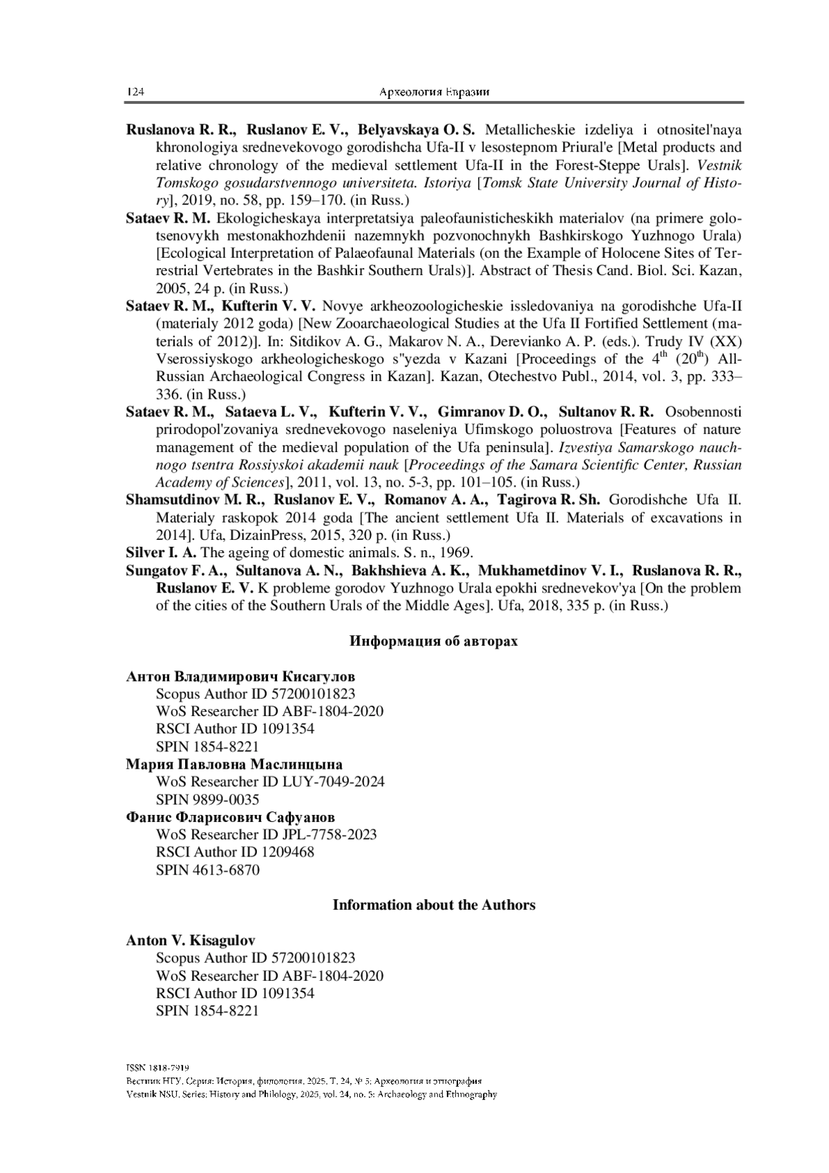Публикуются результаты анализа археозоологической коллекции, собранной в ходе раскопок поселенческого памятника эпохи раннего Средневековья городища Уфа-II в 2023 г. Исследования проходили на локальном участке в юго-западной части памятника. В ходе работ было установлено, что культурный слой на данном участке подвергся мощному антропогенному воздействию во второй половине XX в. – начале XXI в., повлекшему за собой уничтожение / смешение слоев эпохи Средневековья и Нового времени. В связи с данным обстоятельством, результаты археозоологического исследования 2023 г. не позволяют в полной мере привязать остеологический материал к культурным группам раннего Средневековья и Нового времени. В коллекции присутствовали кости млекопитающих, птиц и рыб. Части костей млекопитающих принадлежат в основном домашним животным, доля диких видов незначительна.