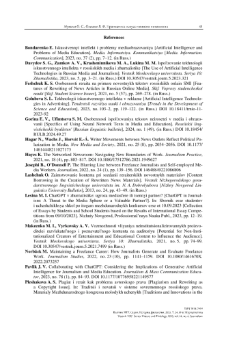 1. Бондаренко Е. А. Искусственный интеллект и проблемы медиаобразования // Медиа. Информация. Коммуникация. 2023. Т. 37, № 2. С. 7-12. Вартанова Е. Л. Цифровая журналистика и медиакоммуникационная среда // МедиаТренды. 2022. № 1 (87). С. 1.