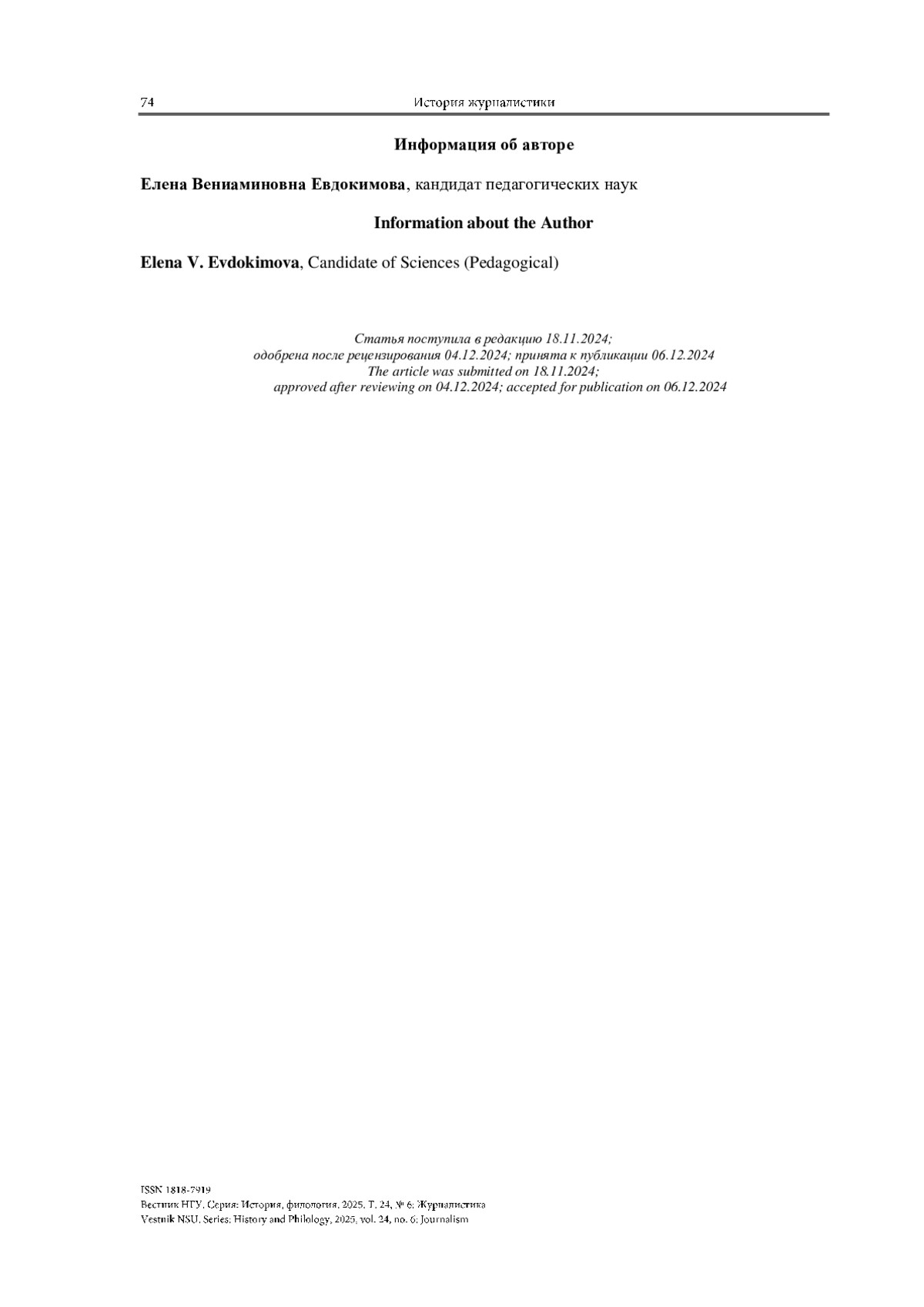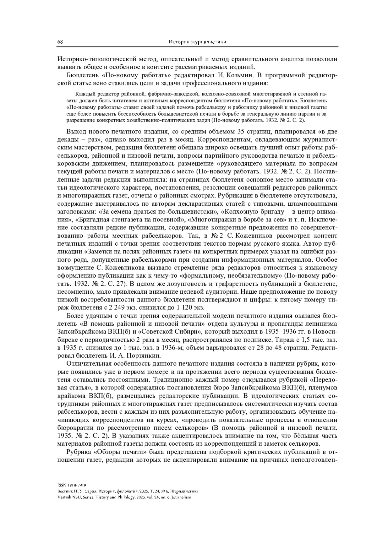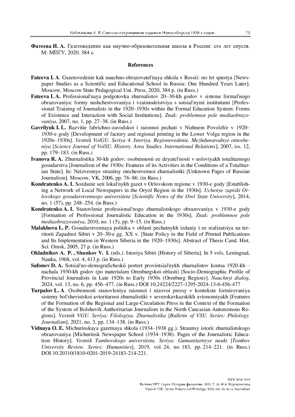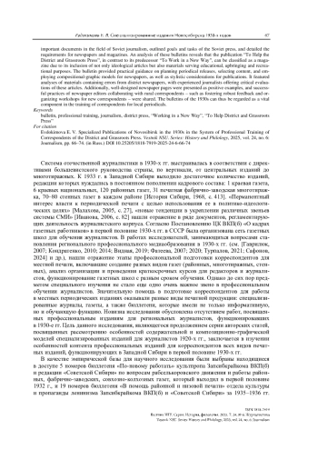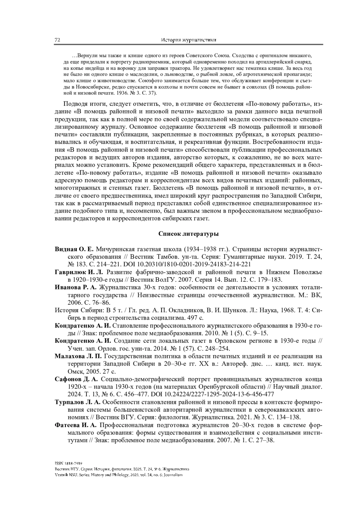 ЕВДОКИМОВА Е. В. СПЕЦИАЛИЗИРОВАННЫЕ ИЗДАНИЯ НОВОСИБИРСКА 1930-Х ГОДОВ В СИСТЕМЕ ПРОФЕССИОНАЛЬНОЙ ПОДГОТОВКИ КОРРЕСПОНДЕНТОВ РАЙОННОЙ И НИЗОВОЙ ПЕЧАТИ // ВЕСТНИК НГУ. СЕРИЯ: ИСТОРИЯ, ФИЛОЛОГИЯ. 2025. ТОМ 24, № 6