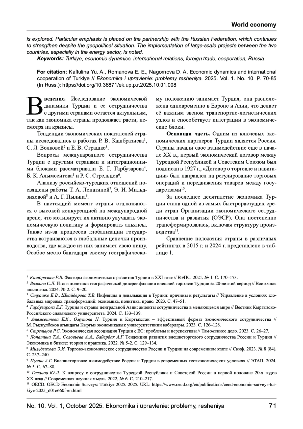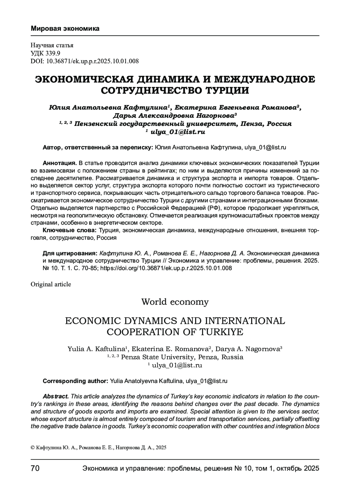 КАФТУЛИНА Ю. А., РОМАНОВА Е. Е., НАГОРНОВА Д. А. ЭКОНОМИЧЕСКАЯ ДИНАМИКА И МЕЖДУНАРОДНОЕ СОТРУДНИЧЕСТВО ТУРЦИИ // ЭКОНОМИКА И УПРАВЛЕНИЕ: ПРОБЛЕМЫ, РЕШЕНИЯ. 2025. ТОМ 1 № 10