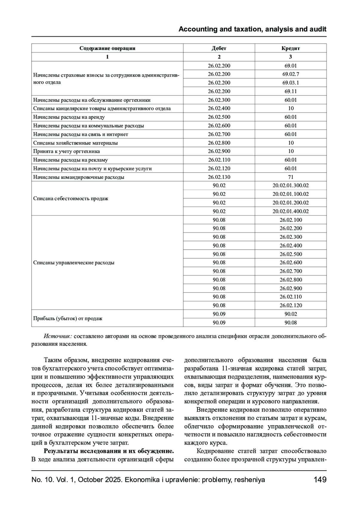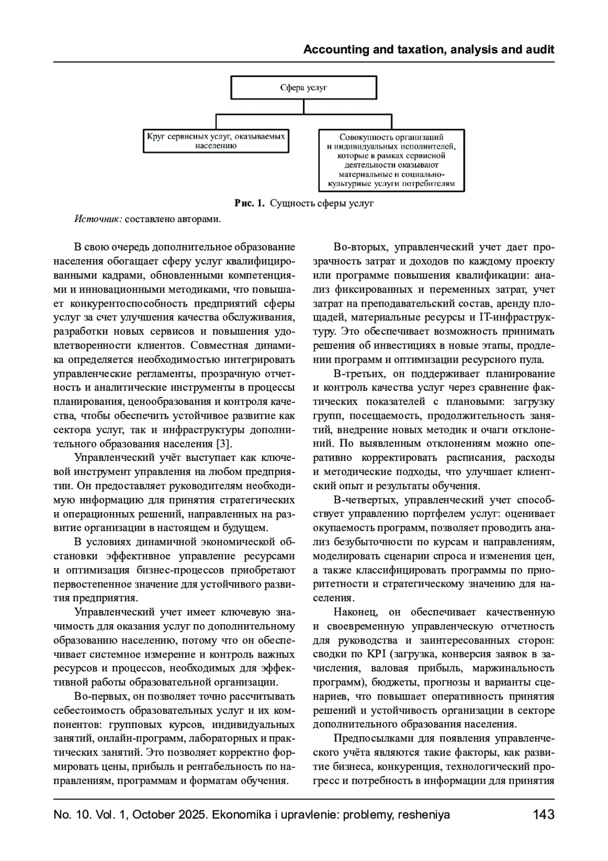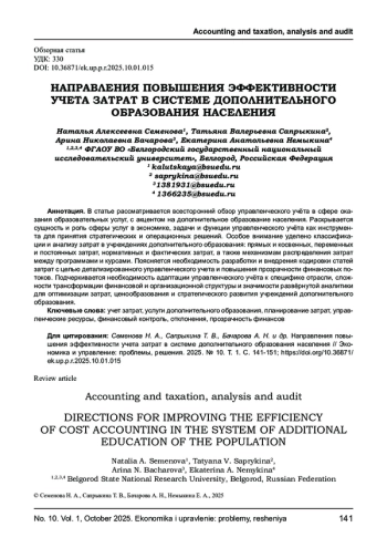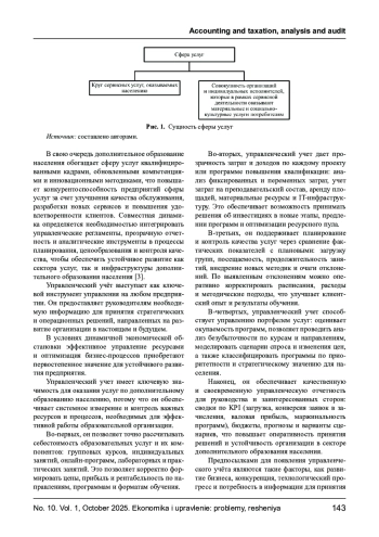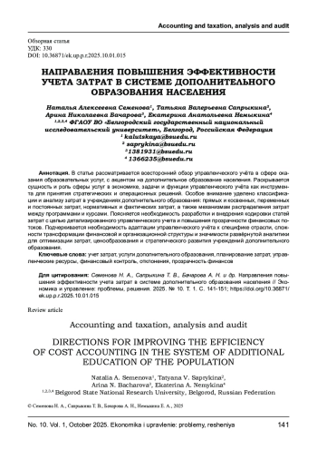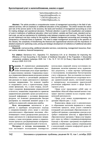 В статье рассматривается всесторонний обзор управленческого учёта в сфере оказания образовательных услуг, с акцентом на дополнительное образование населения. Раскрывается сущность и роль сферы услуг в экономике, задачи и функции управленческого учёта как инструмента для принятия стратегических и операционных решений. Особое внимание уделено классификации и анализу затрат в учреждениях дополнительного образования: прямых и косвенных, переменных и постоянных затрат, нормативных и фактических затрат, а также механизмам распределения затрат между программами и курсами. Поясняется необходимость разработки и внедрения кодировки статей затрат с целью детализированного управленческого учета и повышения прозрачности финансовых потоков. Подчеркивается необходимость адаптации управленческого учёта к специфике отрасли, сложности трансформации финансовой и организационной структуры и значимости развёрнутой аналитики для оптимизации затрат, ценообразования и стратегического развития учреждений дополнительного образования.